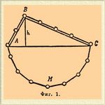 Перекинем через такое тело тяжелую цепь, концы которой связаны один с другим; тогда цепь расположится, как это показано на фиг. 1. Часть цепи AMC можно рассматривать как уравновешенную точно таким образом, как будто она была закреплена в A и C. Остаются части AB и BC, взаимно уравновешивающиеся. Часть AB представляет собой груз во столько раз меньший сравнительно с грузом, представляемым частью BC, во сколько AB меньше BC. Если грузы, пропорциональные сторонам AB и BC, взаимно уравновешиваются, то равные между собой грузы уравновешиваются на Н. плоскостях силами, обратно пропорциональными сторонам AB и BC. Итак, силы, заставляющие груз скользить с Н. плоскости, т. е. действующие параллельно Н. плоскости, при той же высоте h, обратно пропорциональны длине Н. плоскости. Но сила, действующая на груз, прислоненный к вертикальной плоскости, равна весу P груза. Следовательно (фиг. 2), сила Q, действующая на тело, лежащее на Н. плоскости параллельно наклону этой плоскости, относится к весу этого тела как высота h к длине плоскости BC.