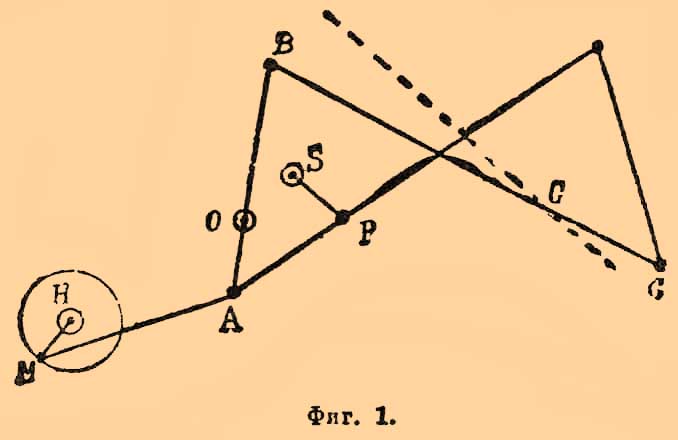 В нем AB=CD; BC=AD; SP=SO, стержни, изображенные толстыми линиями, соединены между собой в указанных крупными точками местах шарнирами. Шарниры O, S, H неподвижны. Длина кривошипа НМ и шатуна MA произвольна, лишь бы при вращении стержня HM точка A колебалась по дуге описанной из O радиусом OA. Положения точек P и G определяются как пересечения стержней AD и BC с прямой OG, проведенной параллельно BD из произвольно взятой на AB точки O. Этот механизм видоизменен много в следующий (фиг. 2), к которому можно присоединить также шатун и кривошип, не изображенные на фиг. 2.