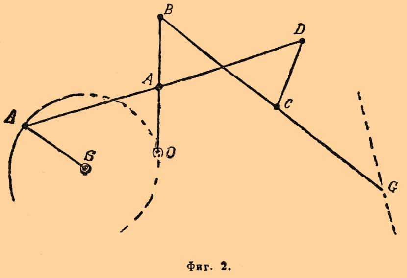 1) антипараллелограмм Гарта (фиг. 1) преобразует движение точки M по окружности в движение точки G по прямой.