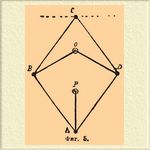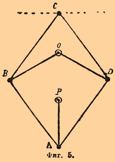 4) Отрицательный инверсор Посселье (фиг. 5). В нем C чертит перпендикулярную к PO прямую; шарниры O и P неподвижны; АВ=ВС=CD=AD; ОР=АР. Произведение AO∙OC остается постоянно равным BC2—OB2.