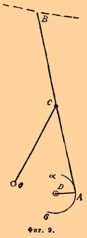 2) Прямило Чебышева (фиг. 8), ведущее точку B приблизительно по прямой при движении точки A по дуге α A β. Этот механизм замечательно мало отклоняет точку B от прямолинейного движения. Условия: ОС=АС = ВС =64; OD=25; AD= 11. Стержень АСВ не сгибается в точке C; шарниры O и D неподвижны.