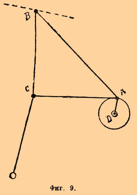 3) Непрерывный трансформатор Чебышева. Замечательнейший из всех Н. механизмов, потому что, состоя только из трех подвижных частей, не нуждается, для преобразования непрерывного вращения (а не колебания только) в прямолинейное движение, в прибавлении кривошипа и шатуна, так как в этом замечательном механизме непрерывное вращение стержня DA около точки D непосредственно преобразуется в поступательное движение точки B, весьма мало уклоняющееся от прямолинейного и совершающееся взад и вперед. Механизм состоит из прямоугольного треугольника АСВ (который может быть заменен стержнем, согнутым в точке C под прямым углом) с равными катетами CA и CB, стержня OC, равного CA, и стержня AD. Размеры могут быть следующие: AC=BC=OC=100; OD=141; DA=5.