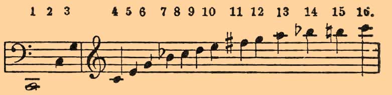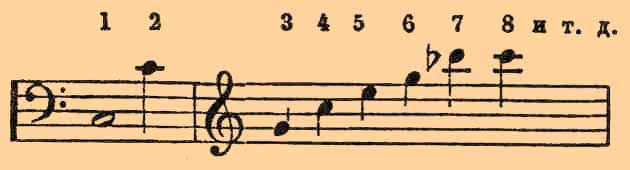 — Н. гамма есть тот ряд звуков, который получается при колебании тела, издающего звук, или столба воздуха. Звуки Н. гаммы, или так называемые гармонические звуки, идут в известном порядке: от данного нижнего или первого звука второй отстоит на чистую октаву, третий от второго — на чистую квинту, четвертый от третьего — на чистую кварту, пятый — на большую терцию, шестой — на малую терцию, седьмой — на малую терцию, восьмой — на большую секунду; далее идут звуки, отстоящие друг от друга на секунду. Например, если ударить на фортепьяно ноту до в малой октаве, то получится следующий ряд частных звуков: