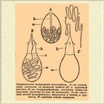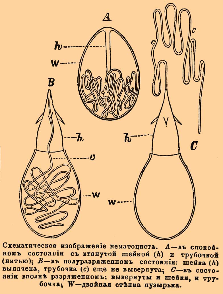 Схематическое изображение нематоциста. A — в спокойном состоянии со втянутой шейкой (h) и трубочкой (нитью); B — в полуразряженном состоянии: шейка (h) выпячена, трубочка (c) еще не вывернута; C — в состоянии вполне разряженном: вывернуты и шейка, и трубочка; W — двойная стенка пузырька.