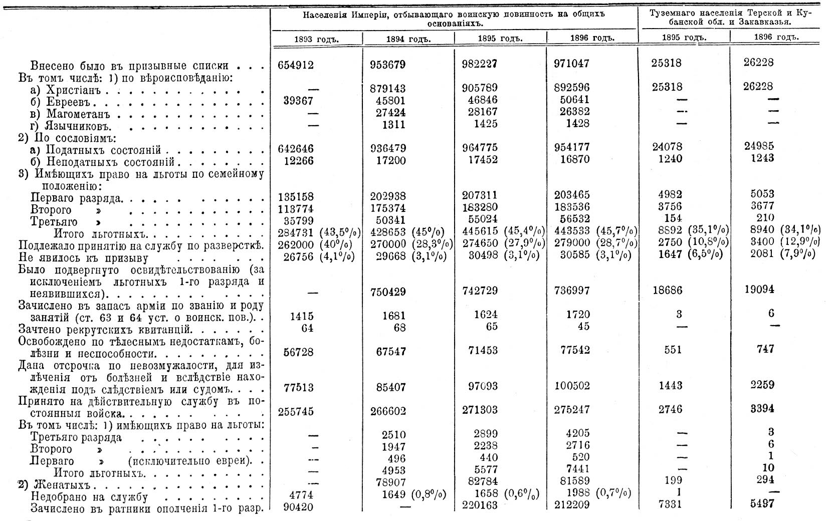 Для пояснения значительной разницы цифры внесенных в призывные списки и % подлежавших принятию на службу в 1893 г. и в послед. годы необходимо отметить, что ранее ежегодно призывались к жребию такие молодые люди, которым к 1-му января года призыва исполнилось 20 лет, а в 1893 г. возраст призываемых был повышен: положено привлекать к жребию тех, кому к 1 октября года призыва минуло 21 год (Собр. узак. 1893 г., № 26). Поэтому в 1893 г. в призывные списки попали лишь родившиеся в промежуток с 1 января по 1 октября 1872 г., т. е. в течение не целого года, а 9 месяцев.