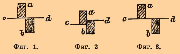 (Ciseaux, Scheeren, scissors) — Н. разрезываемый материал подвергается так называемому сдвигу. Если а н b фиг. 1 представляют разрезы обеих половинок Н., а cd разрезываемый лист, то при сближении а с b частицы вещества, находившиеся в плоскости ab, будут принуждены скользить одна относительно другой, не выходя из этой плоскости, пока не отделяются (фиг. 2). Чтобы такой результат мог осуществиться, необходимо плотное прикосновение а и b; если они отстоять одна от другой, как на (фиг. 3), то разрезываемый лист cd просто повернется или согнется около ребра, когда что-либо удерживает одну его половину.