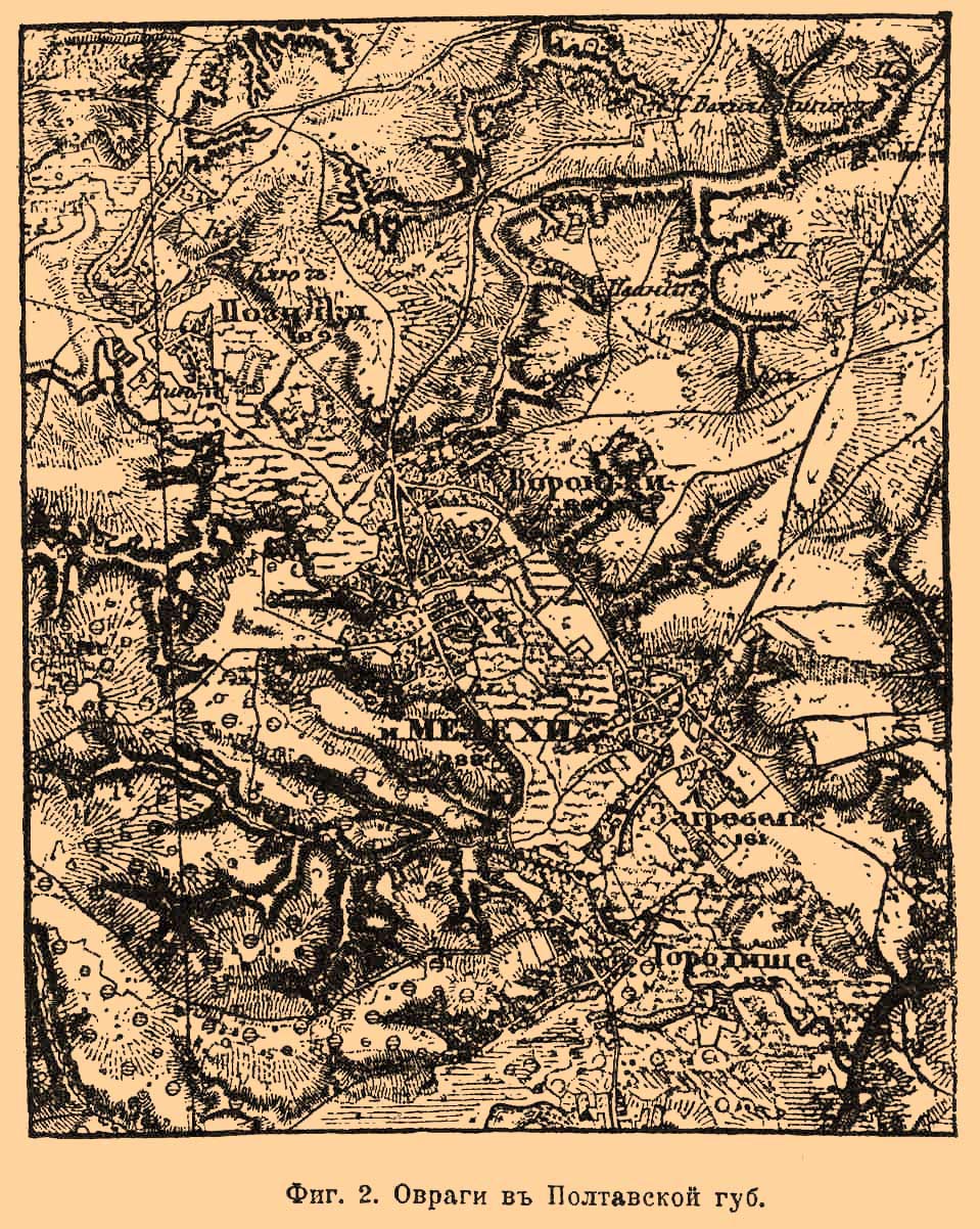 Чтобы судить об овражистости южной России, достаточно взглянуть на прилагаемый клочок трехверстной карты Полтавской губернии, которую можно считать еще средней по изрезанности О. (фиг. 2).
