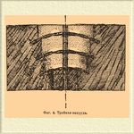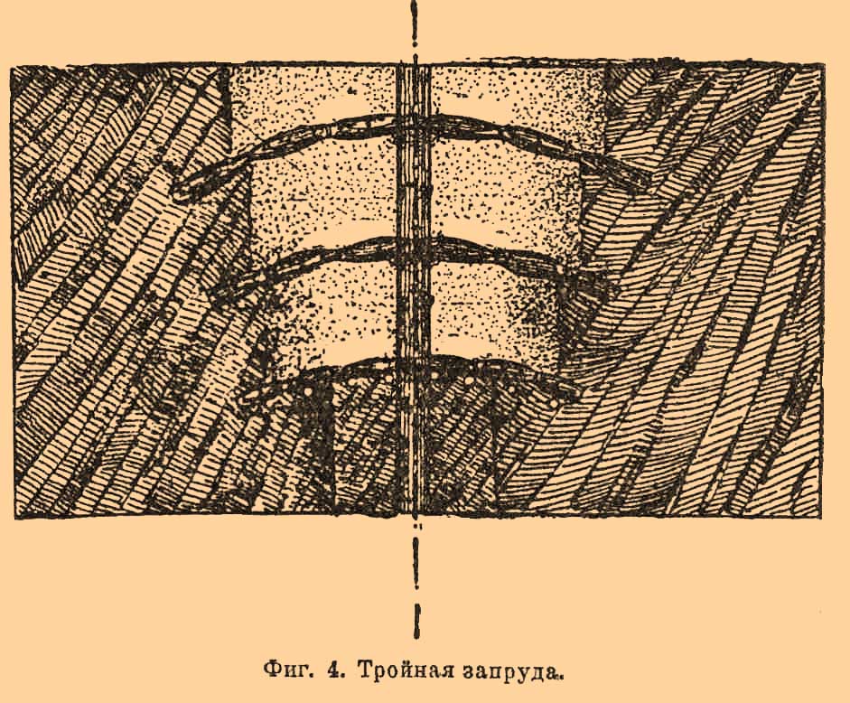 Впрочем, в зависимости от свойства почвы и состояния ее поверхности, большая или меньшая часть бассейна будет впитывать выпадающую на нее воду, которая, следовательно, не будет стекать в О. Для данных свойств почвы границы такой безопасной части бассейна будут определяться некоторым предельным углом наклона поверхности. Но точное определение площади бассейна важно при регулировании горных потоков, где значительный бассейн с крутыми склонами требует устройства капитальных запруд, заграждения же, устраиваемые в О., несмотря на всю свою легкость, обыкновенно оказываются с избытком достаточными. Эти заграждения устраивают из кольев и хвороста, который или связывают в фашины, или заплетают между вколоченными в землю кольями. В особенно опасных местах такие заграждения делают двойными или даже тройными (фиг. 4), но в громадном большинстве случаев ограничиваются одиночными.