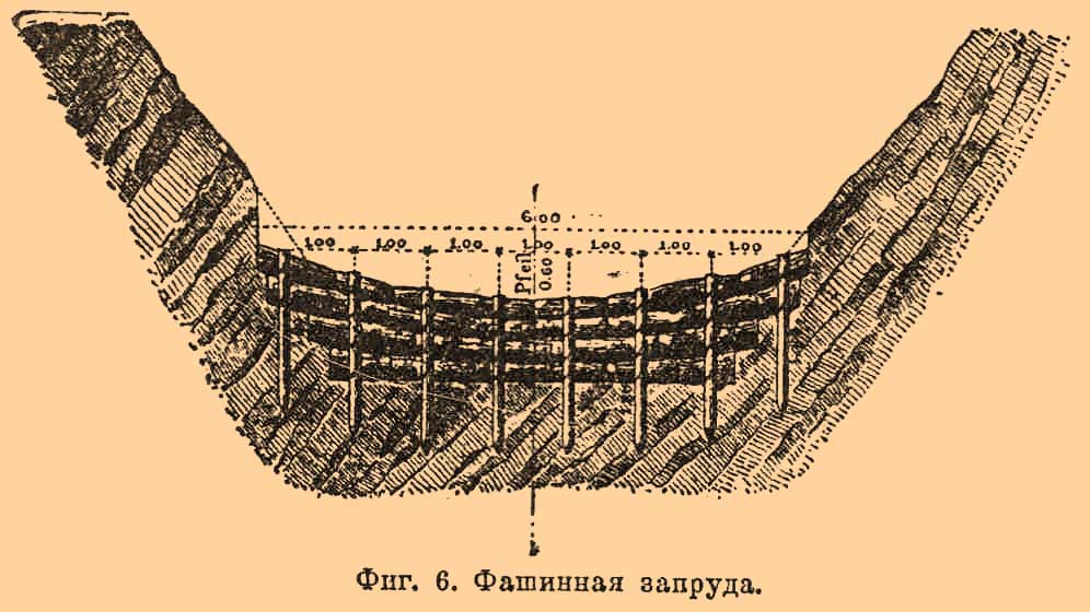 Разрез запруды из заплетенного хвороста изображен на фиг. 5, фашинной — на фиг. 6.