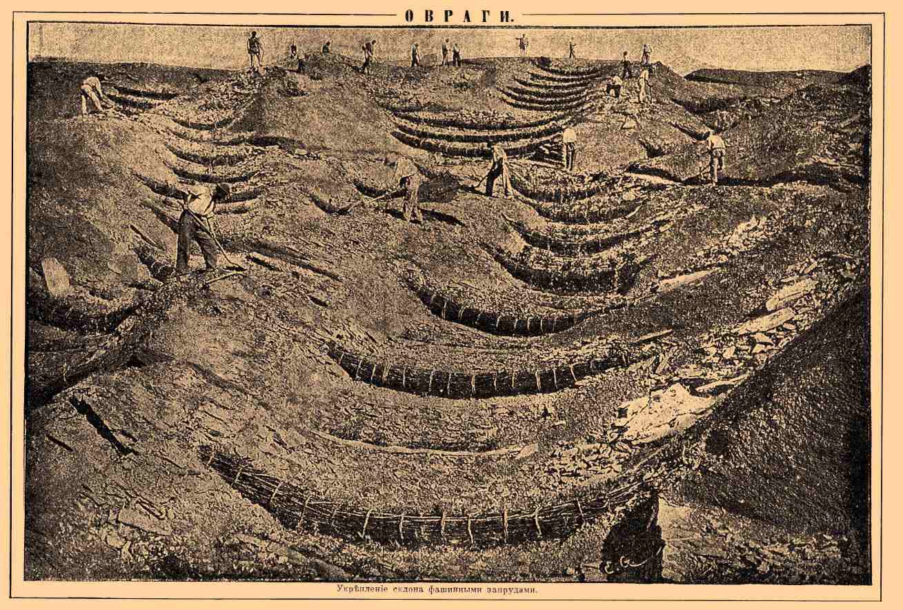 Укрепление оврагов. Не на всех почвах О. образуются одинаково быстро; для образования их необходимо, с одной стороны, периодическое появление масс воды, которые не могут быть впитаны почвой, с другой, известная склонность. почвы к размывам, обусловленная малой связностью ее частиц. Наиболее сильное влияние периодически стекающих вод приходится наблюдать на склонах гор, вершины которых покрыты вечными снегами, затем на склонах более или менее обширных плоскогорий (например Яйла в Крыму); в этих случаях разрушительная сила воды в чрезвычайной степени усиливается быстротой ее течения по более или менее крутому склону, так что наиболее связные почвы легко поддаются размыванию. Только присутствие леса ослабляет скорость стекания воды и защищает почву склонов от размывов. В равнинных местностях периодически появляющиеся воды не приобретают такой значительной скорости и такой разрушительной силы; кроме того, значительная часть медленно протекающей воды может впитываться почвой. Поэтому не всегда в равнинах наблюдаются и размывы: присутствие травянистого покрова (дерна), подобно присутствию леса на склонах гор, ослабляет скорость стекания вод и, кроме того, увеличивает связность верхнего слоя почвы, в котором обильно ветвятся корни травянистых растений. Уничтожение травянистого покрова, скреплявшего почву, часто оказывается достаточным, чтобы проявилась разрушительная сила воды и появились размывы почвы. Уничтожение, вернее ослабление, травянистого покрова происходит чаще всего под влиянием пастьбы скота, который, сверх того, растаптывает верхний слой почвы, ослабляя этим его связность. В значительной степени также способствует образованию промоин распашка почвы. Пашня, правда, значительно сильнее впитывает воду, нежели не распаханная почва, и на совершенно ровном месте может даже прекратить стекание периодически появляющихся вод [Одно из редких исключений можно наблюдать у нас в степях, где поздний снег падает часто на успевшую уже замерзнуть почву и получающаяся при таянии его вода стекает по замерзшей почве не просачиваясь в нее.]; но связность почвы настолько уменьшается при распашке, что достаточно малейшей неровности, ничтожной ложбинки, чтобы могло обнаружиться размывание почвы. Чем более разрастается О., тем сильнее проявляется в нем разрушительная сила воды, подмывающей склоны и выносящей подмытую землю к устью О.; эти выносы (на Кавказе их называют селями) или отлагаются на заливаемых водою местах, образуя нежелательные наносы, или, попадая в реки, способствуют образованию в них отмелей, затрудняющих судоходство. Поэтому продолжающие расширяться, или, как их называют, длительные О. представляют известные опасности для нижележащих мест и укрепление их может представить общегосударственный интерес. О. небольшого протяжения, начавшие образовываться недавно, обыкновенно успокаиваются сами, как только будет устранено влияние причины, вызвавшей образование их, т. е. прекратится выпас скота, распашка склонов и т. п.; склоны такого О. зарастают травой, а иногда и лесом, и он переходит в разряд недеятельных или спокойных. Распашка склонов или усиленная пастьба скота может снова вызвать размывы спокойного О. и обусловить его дальнейший рост, который выражается в образовании новых разветвлений или так называемых
