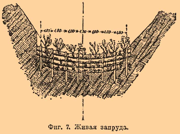 Если для таких запруд употреблять свежий ивовый хворост или свежие ивовые же колья, то они легко укореняются в наносимой к запрудам земле, дают новые побеги и получается живая запруда, отличающаяся особенной прочностью. Такая живая запруда изображена на фиг. 7 [На фиг. 5-7 показаны размеры отдельных частей запруд в метрах.]. Установка
