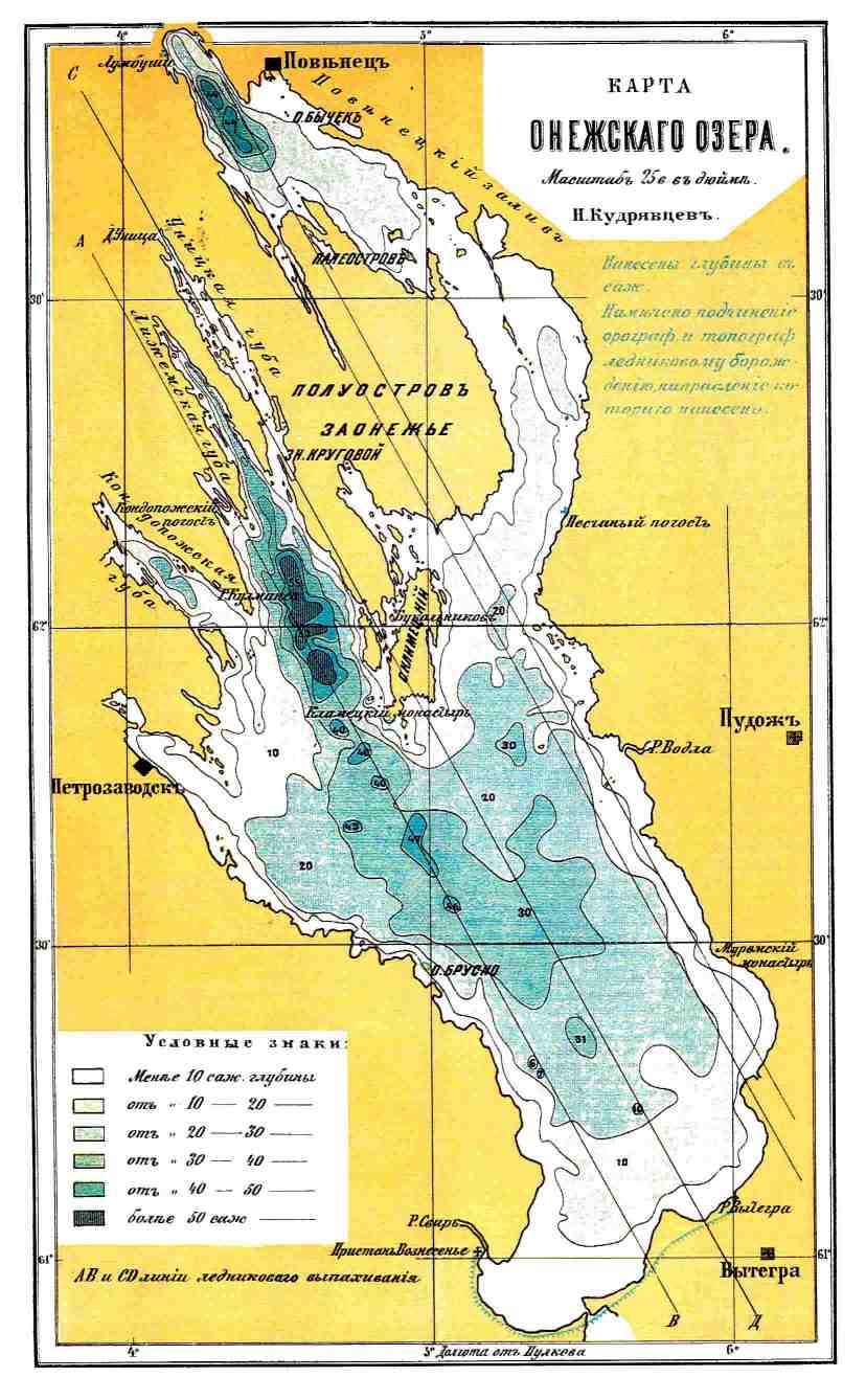 Рельеф дна. Согласно только что законченным гидрографическим работам линия 10-ти саженей (шестифутовая морская сажень) глубины, следуя, в общем, довольно близко очертанию берегов, значительно от них удаляется на юго-западной оконечности озера. Затем эта линия оставляет совершенно в стороне: губу Уницкую, пролив между островом Климецким и Заонежьем, губу Великую и среднюю часть Повенецкого залива. Внутри этой изобаты в северной части южной, широкой половины озера, обширное пространство занято бассейном с глубинами от 30-40 саженей, посреди которых встречается несколько мест с глубинами, доходящими до 47-48 саженей. Наибольшие глубины встречаются к северу от линии Петрозаводск — устье реки Водлы. Здесь находится наибольшая глубина в 6 8 саженей (124 м.) и далее к северу еще несколько впадин с глубинами в 53, 55 и даже 63 сажени. Эти глубины находятся между Заонежьем и материком. Следует заметить, что все впадины с наибольшими глубинами как в северной, так и в южной частях озера, вытянуты по характерному для О. озера направлению от северо-северо-запада к юго-юго-востоку. Затем значительные глубины еще встречаются в самой северной оконечности Повенецкого залива, где они доходят до 44 саженей.