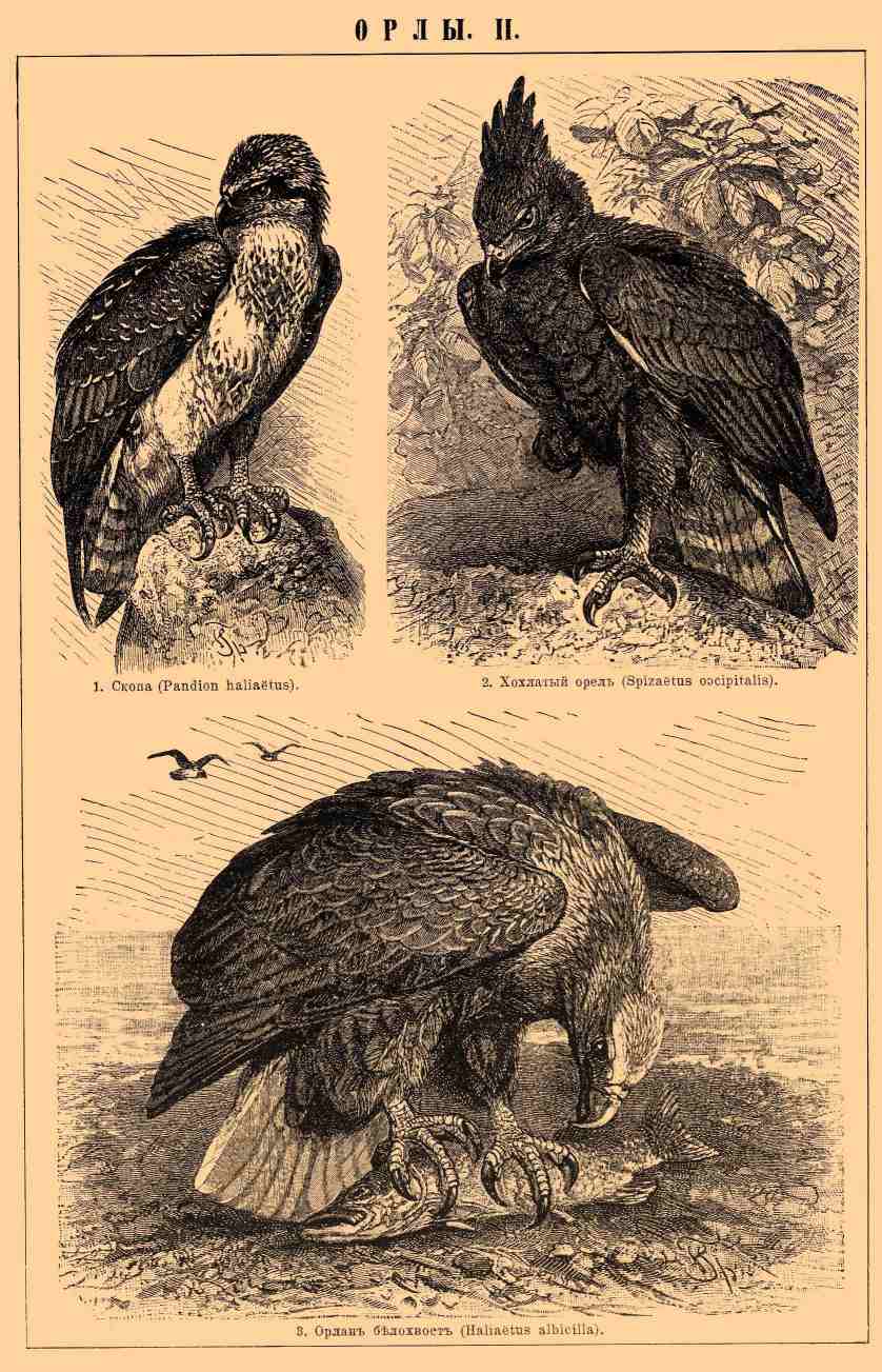 1. Скопа (Pandion haliaёtus). 2. Хохлатый орел (Spiziaёtus oecipitalis). 3. Орлан белохвост (Haliaёtus albicilla).