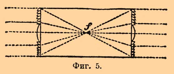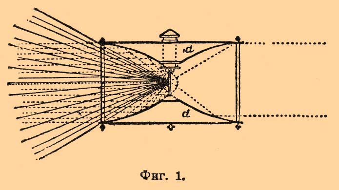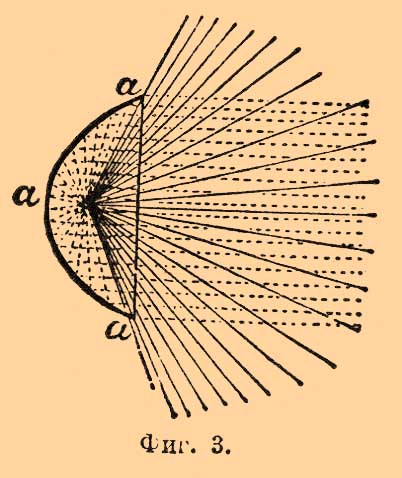 Общий недостаток таких катоптрических приборов — собирать лишь некоторую часть лучей — виден из фигуры 3, в которой пунктиром начерчены лучи, идущие пучком в желаемом направлении, а сплошной чертой лучи, пропадающие даром.