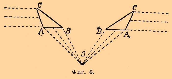 Как ступенчатые стекла, так и ступенчатые цилиндры шлифуются не из одного куска, но, по предложению Френеля, составляются из многих отдельных частей, порознь приготовленных. 3) Призматические кольца с полным внутренним отражением. Представим себе (фиг. 6) кольцо, которого сечение есть ABC, при определенном положении его относительно лампы S можно углы его А, В, С рассчитать так, что пучок лучей, попадающий на нижнюю грань AB, благодаря преломлению у AB, полному внутреннему отражению у ВС и новому преломлению у АС из АС выйдет параллельным пучком; такое призматическое кольцо равносильно, следовательно, узкому элементу ступенчатого цилиндра.