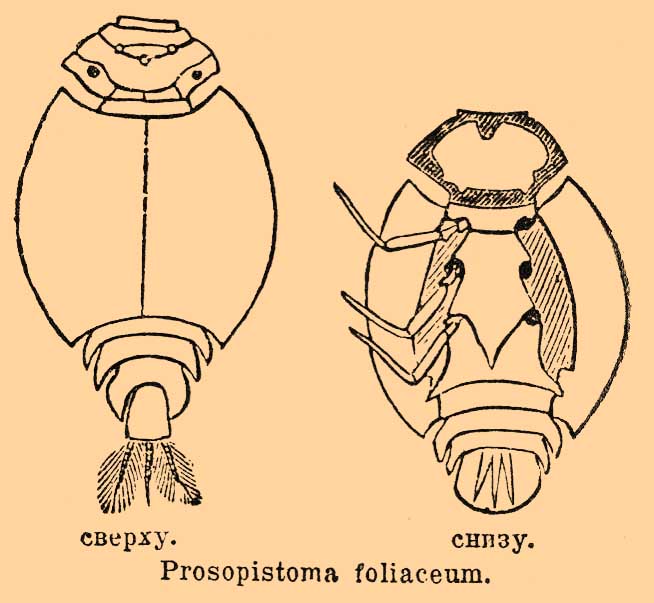 Prosopistoma foliaceum. Слева — вид сверху; справа — вид снизу.