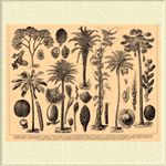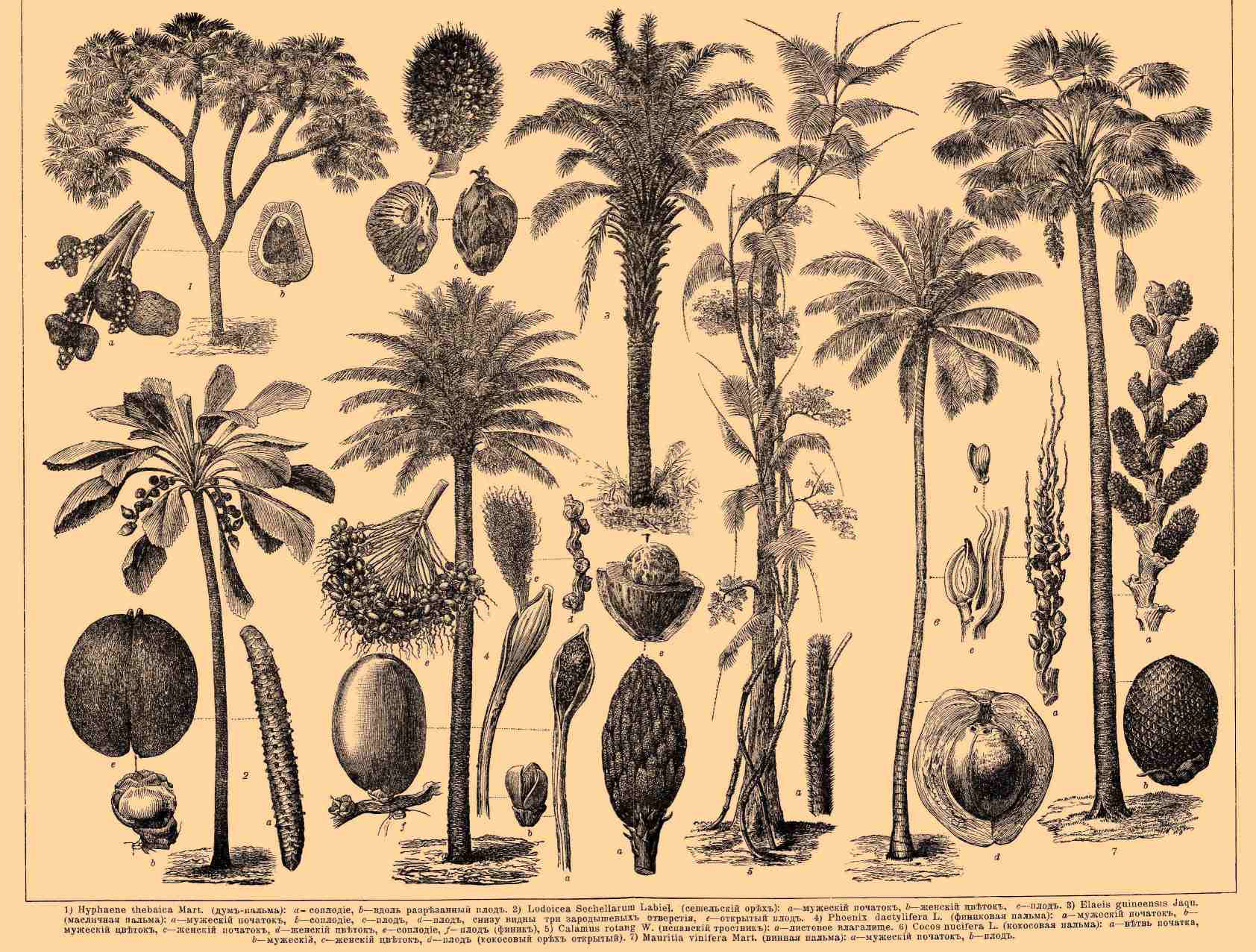 Пальмы I. 1) Hyphaene thebaica Mart. (дум-пальма): а — соплодие, b — вдоль разрезанный плод. 2) Lodoicea Sechellarum Labiel. (сешельский орех): а — мужеский початок, b — женский цветок, с — плод. 3)Elaeis guineensis Jaqu. (маслиничная пальма): а — мужеский початок, b — соплодие, с — плод, d — плод, снизу видны три зародышевых отверстия, е — открытый плод. 4) Phoenix dactylifera L. (финиковая пальма): а — мужеский початок, b — мужеский цветок, с — женский початок, d — женский цветок, е — соплодие, f — плод (финик). 5) Calamus rotang W. (испанский тростник): а — листовое влагалище. 6) Cocos nucifera L. (кокосовая пальма): а — ветвь початка, b — мужеский, с — женский цветок, d — плод (кокосовый орех открытый). 7) Mauritia vinifera Mart. (винная пальма): а — мужеский початок, b — плод.