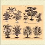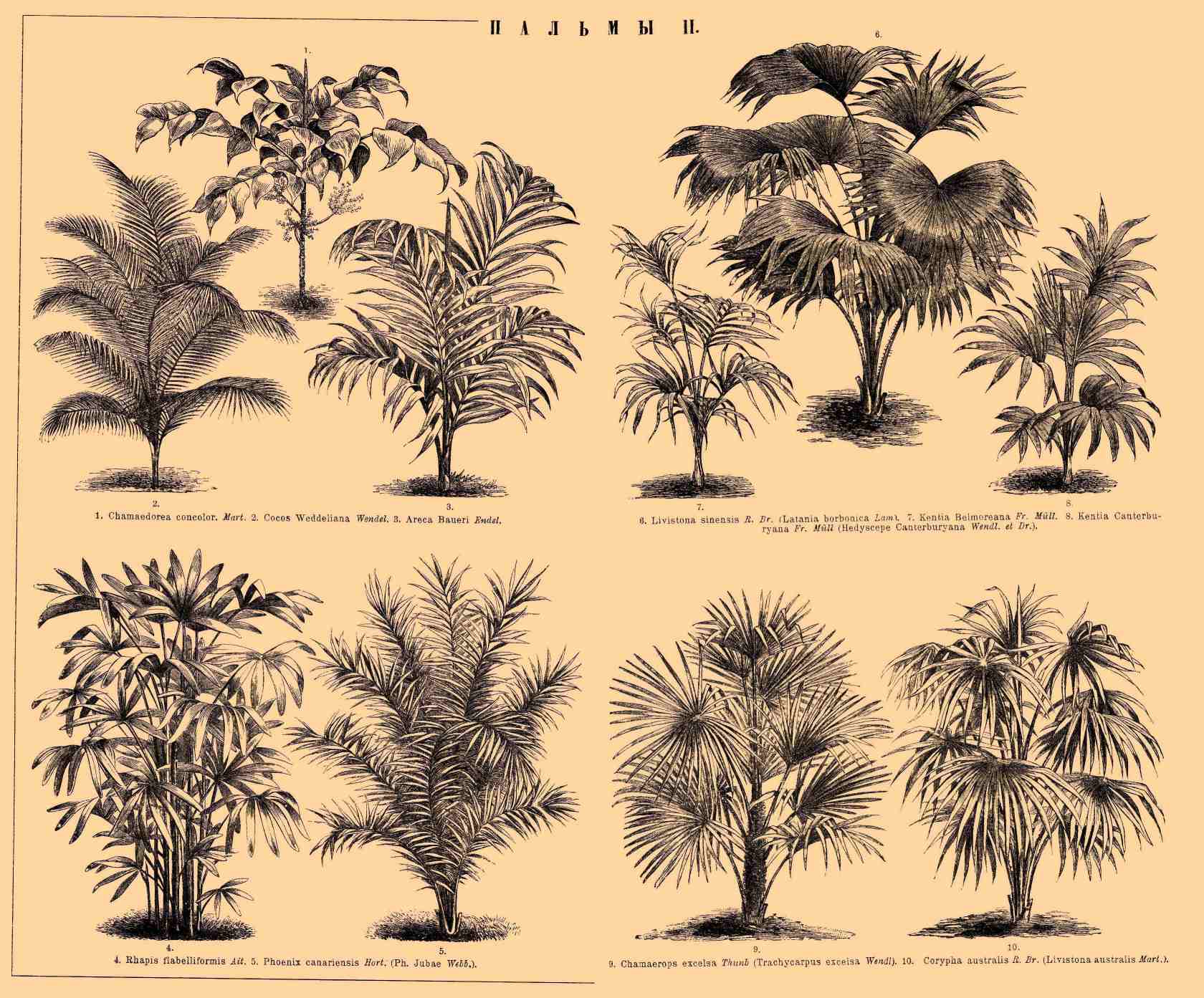 Пальмы II. 1. Chamaedorea concolor. Mart. 2. Cocos Weddeliana Wendel. 3. Areca Baueri Endel. 4. Rhapis flabelliformis Ait. 5. Phoenix canariensis Hort. (Ph. Jubae Webb.). 6. Livistona sinensis R. Br.(Latania borbonica Lam). 7. Kentia Belmoreana Fr. Müll. 8. Kentia Canterburyana Fr. Müll (Hedyscepe Canterburyana Wendl. Et Dr.). 9. Chamaerops excelsa Thunb (Trachycarpus excelsa Wendl). 10. Corypha australis R. Br. (Livistona australis Mart.).