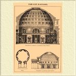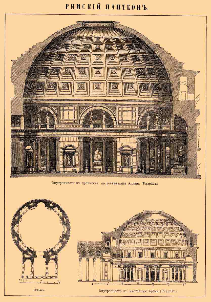 Наибольшей известностью пользуется римский, сооруженный в 25 или 27 г. до Р. Хр. Марком Агриппой, на Марсовом поле, близ им же построенных терм. Он был посвящен божествам рода Юлиев, статуи которых, например Марса и Венеры, стояли внутри этого сооружения. После неоднократных повреждений, причиненных пожарами и ударами молний, П. был реставрирован сперва имп. Домицианом и Адрианом, затем, в 202 г. по Р. Хр., Септимием Севером и его сыновьями. Об этой последней реставрации свидетельствует надпись над портиком храма, помещенная под надписью, высеченной Агриппой. В 1607 г., при папе Бонифации IV, П. был обращен в церковь, посвященную Богоматери и всем мученикам, и получил название S. Maria ad Martyres — церковь, которую вследствие ее круглой формы называют также С. Mapиa-Ротонда, или просто Ротондой. П. представляет собой круглое здание с портиком, не существовавшим в первоначальном плане, но возведенным еще при Агриппе, предполагавшем поместить в нем свою собственную статую и статую Августа. Портик образуют 16 колонн восточного гранита (8 по лицу, каждая в 4,5 м в окружности, с коринфскими беломраморными капителями превосходной работы). Он увенчан фронтоном, в настоящее время лишившимся некогда украшавших его бронзовых фигур. Внутренность П. представляет круглое помещение в 43,5 м ширины и такой же вышины, покрытое полукруглым куполом, с проделанным в середине циркульным отверстием 8,5 м в диаметре. В стенах устроены 8 ниш, в которых помещались статуи божеств; колонны, стоящие теперь в отверстиях этих ниш, относятся ко времени Домициана; они заменили собой другие колонны, находившиеся тут первоначально. Над архитравом идет представляющая собой продолжение цилиндра аттика, которая при одной из реставраций была расчленена пилястрами. Мраморная облицовка этих пилястров была удалена в 1774 г. Пол внутреннего помещения П. выложен порфиром и другими дорогими породами камня. Общее впечатление, производимое П., очень грандиозно, несмотря на то, что здание сильно пострадало вследствие хищнического отношения к нему некоторых императоров (Констант II, в 655 г., перевез в Константинополь вызолоченную бронзовую крышу) и пап. В 1881 и 1 8 82 г. вокруг П. были произведены раскопки, причем с задней его стороны открыты части сооружения, до того времени заслоненные позднейшими постройками, и обнаружен весь цоколь, скрывавшийся под новейшими наслоениями почвы. В П., в числе других знаменитых людей Италии, похоронен Рафаэль и первый король объединенной страны, Виктор-Эмануил II. Кроме римского П., знаменит также парижский. Он стоит на том месте, где некогда стояла церковь, посвященная покровительнице Парижа, св. Женевьеве. В 1764 г. Людовик XV заложил здесь колоссальное здание, которое и было возведено по планам архитектора Суффло. Парижский П. имеет в плане форму греческого равноконечного креста, над срединой которого высится купол на барабане. С западной стороны П. находится обширный портик, образуемый 22 калнелированными колоннами коринфского стиля в 20 м вышины. Ширина всего здания — 84 м, длина — 112 м. Внутренность П. представляет в средине, под куполом, круглое пространство, к которому примыкают четыре боковые крыла. Над куполом фонарь, обведенный решеткой, отсюда открывается великолепный вид на весь Париж. Вышина всего здания от пола до фонаря достигает до 90 м. Здание еще не было окончено п