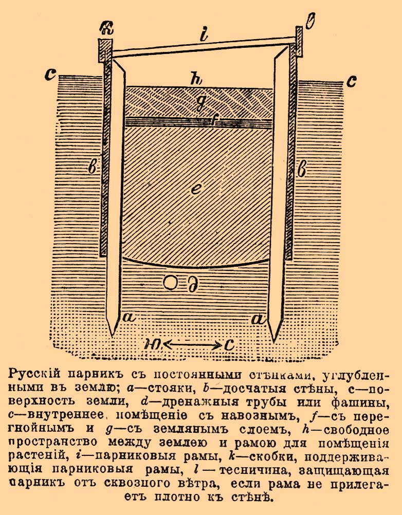 Русский парник с постоянными стенками, углубленными в землю; а — стояки, b — досчатые стены, с — поверхность земли, d — дренажные трубы или фашины, e — внутреннее помещение с навозным, f — с перегнойным и g — с земляным слоем, h — свободное пространство между землей и рамой для помещения растений, i — парниковые рамы, k — скобки, поддерживающие парниковые рамы, l — тесничина, защищающая парник от сквозного ветра, если рама не прилегает плотно к стене.