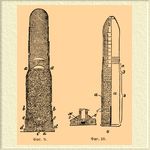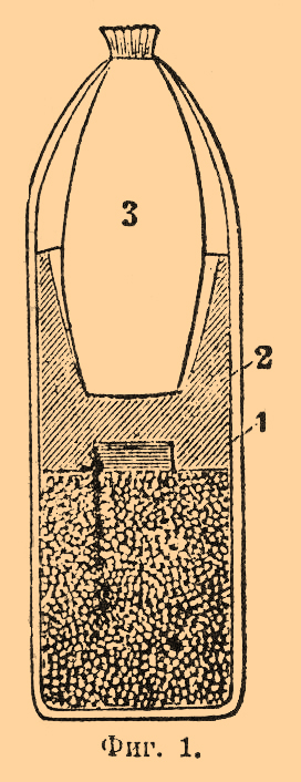 Патрон — пуля (снаряд) и заряд пороха, заключенные в наружную оболочку (гильзу) и таким образом представляющие одно целое. П. бывают боевые и холостые; последние от первых отличаются тем, что пуля у них свернута из полоски бумаги; после вставки в гильзу, снаряженную меньшим количеством пороха, чем в боевом П., последняя обжимается для более плотной посадки пули; употребление бумажной пули необходимо для обеспечения сгорания заряда пороха; холостые П. расходуются на маневрах. В образцах оружия, заряжающегося с дула, порох после отмеривания заряда всыпался в ствол, загонялся с помощью шомпола пыж, затем досылалась пуля. Стремление к скорострельности привело в XVII в. к изобретению П. — заряд пороха помещался в бумажную оболочку, к которой присоединялась и пуля. В 1827 г. Николай Дрейзе предложил унитарный П., состоящий из пули и пороха с лепешкой ударного состава, заключенных в гильзу; с изобретением капсюлей унитарные П. входят в практику, хотя и не сразу, потому что нескоро удалось дать им надлежащее устройство. П. Дрейзе (фиг. 1) состоял из бумажной гильзы (1), куда насыпали порох, затем вставляли шпигель (2, сплошной, папковый цилиндр, в нижнее основание которого впрессовывалась лепешка ударного состава, а в верхнем делалось соответствующее форме пули углубление) и яйцевидную, свинцовую пулю (3).