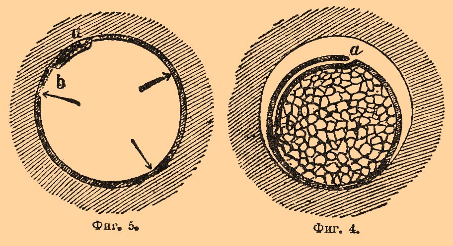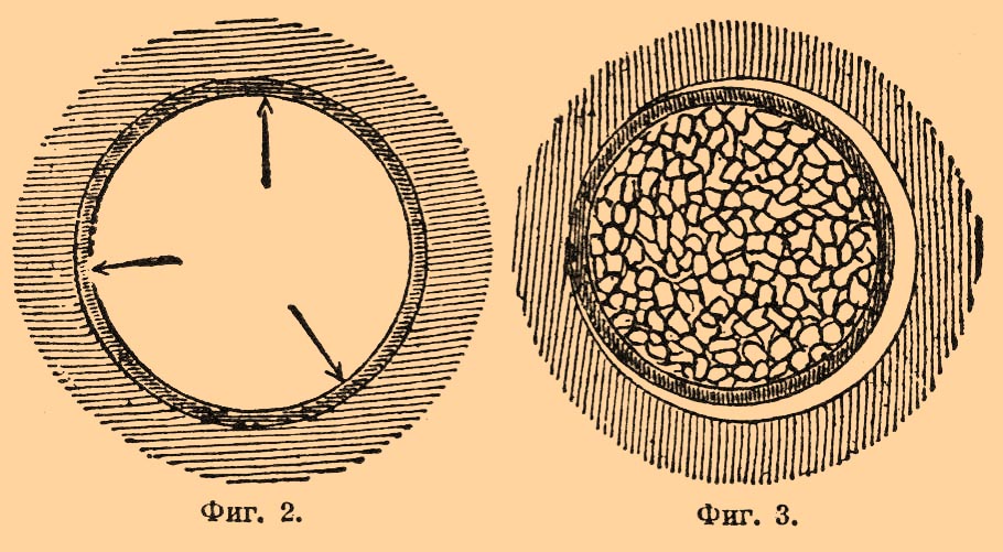 Эти требования выполняются двумя способами, почему и металлические П. разделяются на две категории: П. с цельнотянутыми гильзами и с составными. В цельнотянутых гильзах боковые стенки и дно составляют одно целое, получаются они из кружка листовой латуни последовательными вытяжками. Составные гильзы свертываются из тонкой, листовой латуни в один или несколько оборотов, отдельное дно прочно окрыляется с боковыми стенками; при выстреле (см. фиг. 5 и 4) гильза развертывается и края ее m и n плотно прилегают к патроннику;