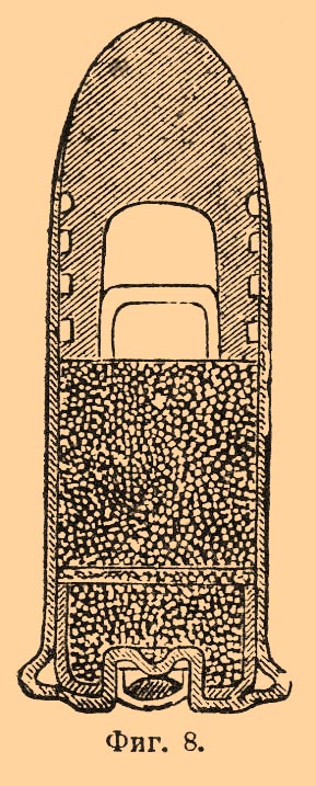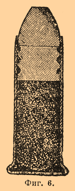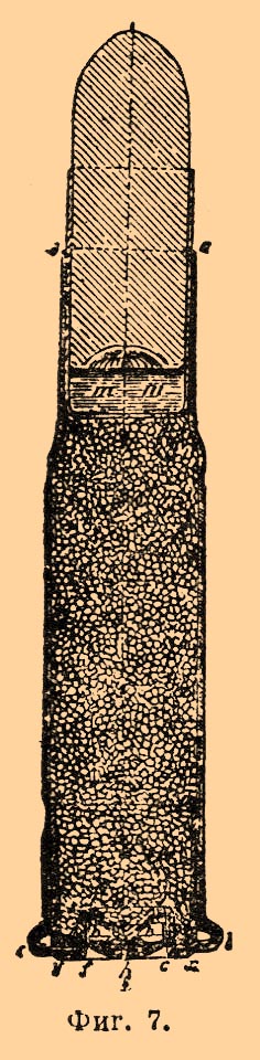 после выстрела он легко извлекается, даже и при большом, в несколько точек, зазоре, тогда как цельнотянутые гильзы действуют исправно только при малом (не более ½ точки) зазоре. После придания гильзе надлежащей формы стенки ее внутри покрываются лаком для предохранения металла от окисления, затем в дно гильзы вставляют капсюль. П. в зависимости от места расположения ударного состава бывают: кругового огня, когда ударный состав впрессовывается внутрь гильзы по окружности ее дна, и центрального огня, когда ударный состав заключается в капсюль и устанавливается в центре дна; все составные П. — центрального огня. В П. кругового огня (фиг. 6) гильзы могут часто разрываться, так как при воспламенении ударного состава (s) дно гильзы, где металл ослаблен двойным перегибом, подвергается наибольшему давлению газов.