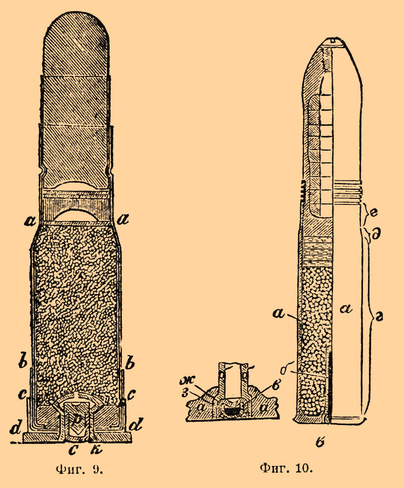В настоящее время унитарные П. приняты и принимаются к пушкам, начиная малыми калибрами и до 6 дм включительно. Так, имеются унитарные П. для 37, 47 и 57 мм канонирных и береговых пушек системы Норденфельдта и 6 дм скорострельных пушек системы Кане для сухопутной и морской артиллерии; предполагается принять унитарный патрон и для полевых орудий. Унитарный патрон к 57 мм канонирной пушке (фиг. 10) состоит из 1) снаряда, 2) боевого заряда, 3) войлочных прокладок между зарядом и снарядом и 4) латунной цельнотянутой гильзы с запальной трубкой и капсюлем; снаряды двух родов: граната и картечь. Гильза (а) соединяет в одно целое снаряд, заряд, запальную трубку (б) и капсюль (в) и служит обтюратором. Дно гильзы с закраинами, обточенными по конусу, отвечающему конической выточке на передней стене замочного отверстия; закраина ограничивает продвигание гильзы в патронник и служит для захватывания экстрактором при выбрасывании стреляной гильзы. Боковые стенки гильзы образуют конус (г), скат (д) и дульце (е), в которое вставляется снаряд. В центре дна гильзы имеется канал с уширением для вставки запальной трубки: последняя — цилиндрическая с цилиндрической головкой, плотно входящей в уширение канала гильзы; в головке трубки (б) имеется гнездо для вставки капсюля, состоящего из латунной чашки (ж) с томпаковым колпачком (з), в дне которого запрессован взрывчатый состав, прикрытый фольговым кружком. Между гранатой и боевым зарядом прокладывается 5 кружков войлока в ¼", а между картечью и зарядом — один. В П. 57 мм береговой скорострельной пушки (б) заряд заключен в картуз из шелковой ткани и затем уже вставлен в гильзу; кроме обыкновенной чугунной гранаты и картечи имеется стальная граната и стальная диафрагменная шрапнель.