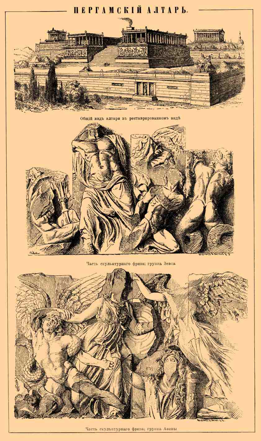 — Под этими словами обыкновенно разумеются открытия в конце семидесятых годов нынешнего столетия развалин колоссального жертвенника, сооруженного в пергамском акрополе царем Евменом II (196—157) и посвященного Зевсу в память победы, одержанной названным государем над галлами, и фрагменты скульптурных произведений, украшавших этот жертвенник. Почин в деле открытия этих памятников искусства был сделан немецким инженером Гуманом, который по поручению турецкого правительства прибыл в 1864 г. в деревню Бергамо — пункт, где находилась столица древнего П. царства, — для устройства в той местности мостов и дорог. Систематические раскопки Пергама были, однако, предприняты лишь в сентябре 1878 г., когда Гуману удалось убедить германское правительство в важности исследования открытых развалин. Раскопки продолжались до марта 1880 г. В настоящее время благодаря предложенной немецким архитектором Рихардом Боном реставрации П. жертвенника мы можем составить себе ясное понятие о виде и размерах этого памятника. П. жертвенник представлял собой обширное квадратное сооружение, каждая сторона которого имела до 70 м длины. Нижняя его часть состояла из массивной стены высотой в 5 м, поставленной на три мраморные ступени и обрамленной сверху и снизу карнизом. С южной стороны в нее врезалась широкая лестница, которая вела на обширную платформу, где в центральной части, по всей вероятности, и помещался сам жертвенник. С трех сторон платформы шел портик ионийского стиля, украшенный внутри скульптурным мраморным фризом в 1,74 м высотой, с изображением сцен из древнейших преданий П. героического цикла, главным действующим лицом которого является Телеф, сын Геракла. Нижние стены здания, составлявшие его базу, не исключая и частей, которые соприкасались с лестницей, были покрыты непрерывным рядом рельефов высотой в 2,75 м, сюжет которых заимствован из сказаний о борьбе богов с гигантами (гигантомахии).