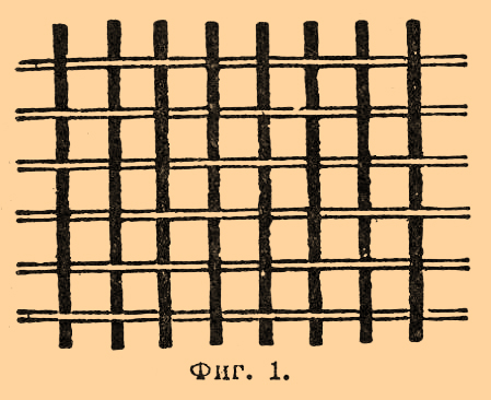 — Всякая ткань, образованная на ткацком станке, состоит из двух взаимно перпендикулярных систем нитей — основы (см.) и утка (см.). Чтобы достигнуть желаемой связи между ними, каждая нить проводится то сверху, то снизу нитей другой системы. Порядок, в котором производится это пропускание нитей между другими, называется способом П. нитей данной ткани. Если, глядя на ткань, видим в какой-нибудь точке пересечения двух нитей основную нить сверху, то эта точка называется основным перекрытием, если же сверху идет уточная нить, то имеем уточное перекрытие. Способ П. обозначается обыкновенно на клетчатой бумаге, в которой вертикальные полоски условлено принимать за основные, а горизонтальные — за уточные нити. Клетки, соответствующие основным перекрытиям, отмечаются крестом, точкой или другим знаком; уточные перекрытия ничем не обозначаются. Таким образом, П. ткани, имеющей вид, как на фиг. 1. изображается так, как показано на фиг. 2.