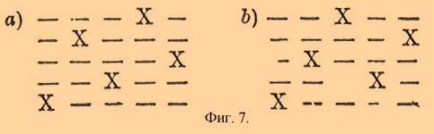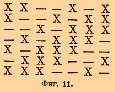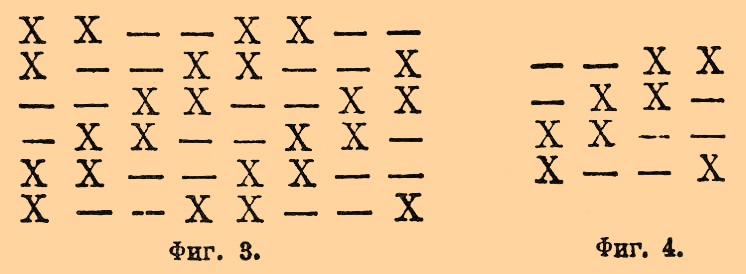 При неимении под рукой клетчатой бумаги способы П. записываются столбцами, в которых горизонтальные строчки обозначают уточные нити, а вертикальные колонны — основные. Уточные перекрытия обозначаются знаком (—), основные крестом или буквами Х или О. Так, предыдущее (фиг. 1 и 2) П. изображается, как показано на фиг. 3.