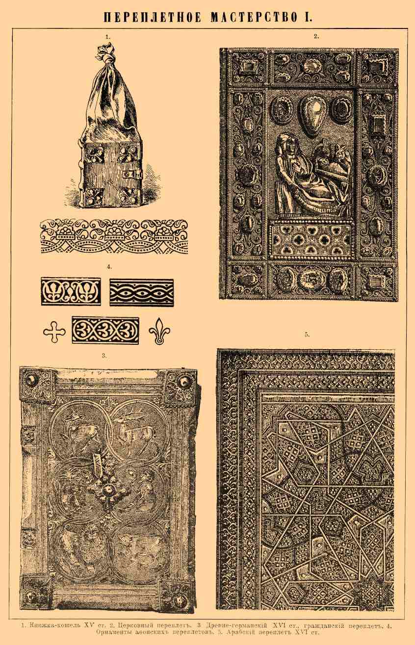 1. Книжка-кошель XV столетия. 2. Церковный переплет. 3. Древнегерманский, XVI столетия, гражданский переплет. 4. Орнаменты афонских переплетов. 5. Арабский переплет XVI столетия.