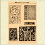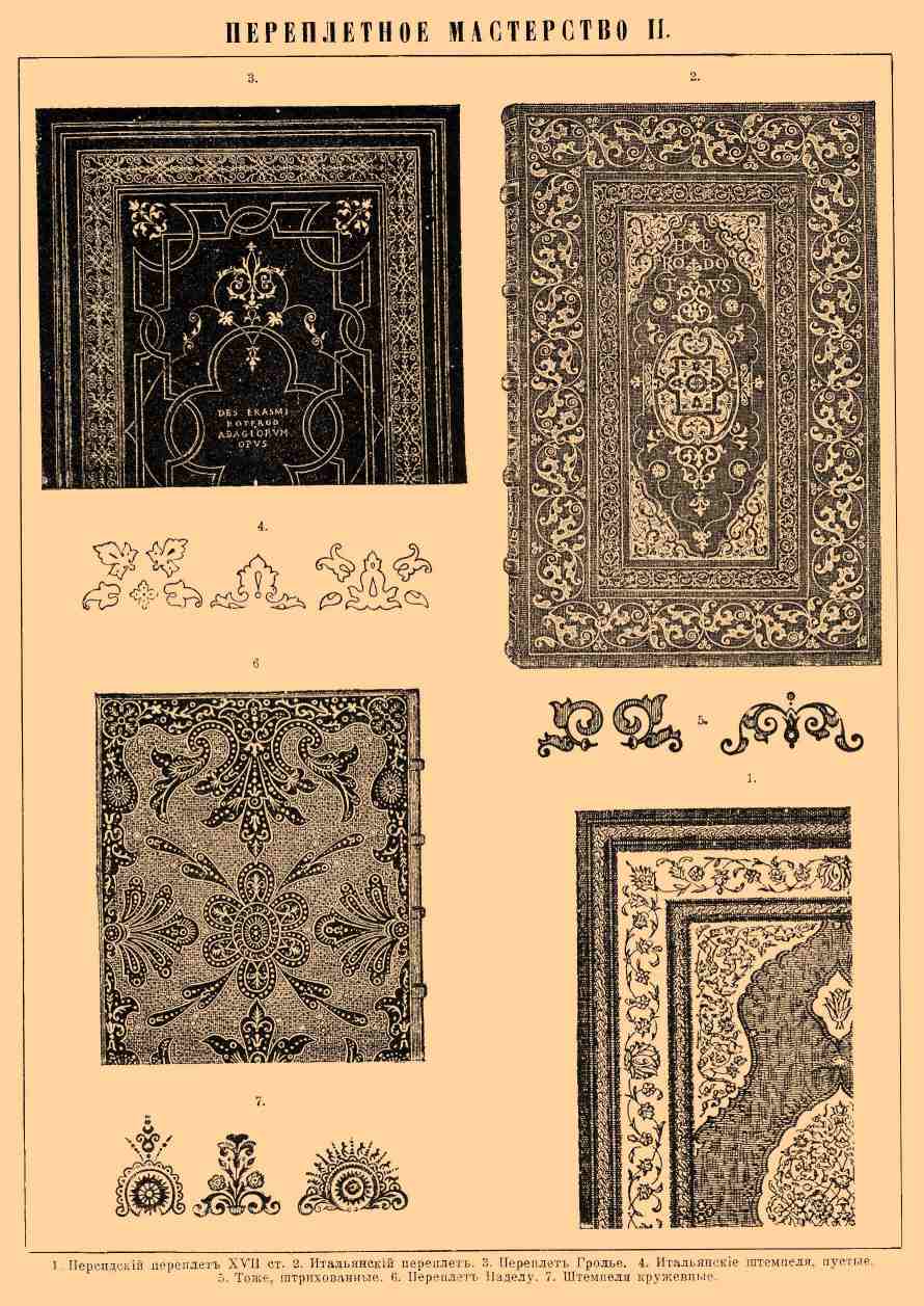 1. Персидский переплет XVII ст. 2. Итальянский переплет. 3. Переплет Гролье. 4. Итальянские штемпеля, пустые. 5. Итальянские штемпеля, штрихованные. 6. Переплет Паделу. 7. Штемпеля кружевные.