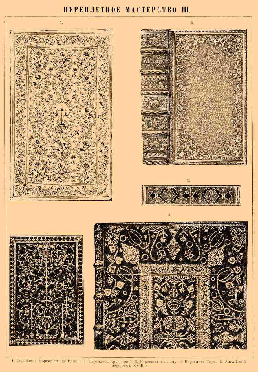 1. Переплет Маргариты де Валуа. 2. Переплет кружевной. 3. Корешок к нему. 4. Переплет Тори. 5. Английский переплет XVIII в.