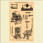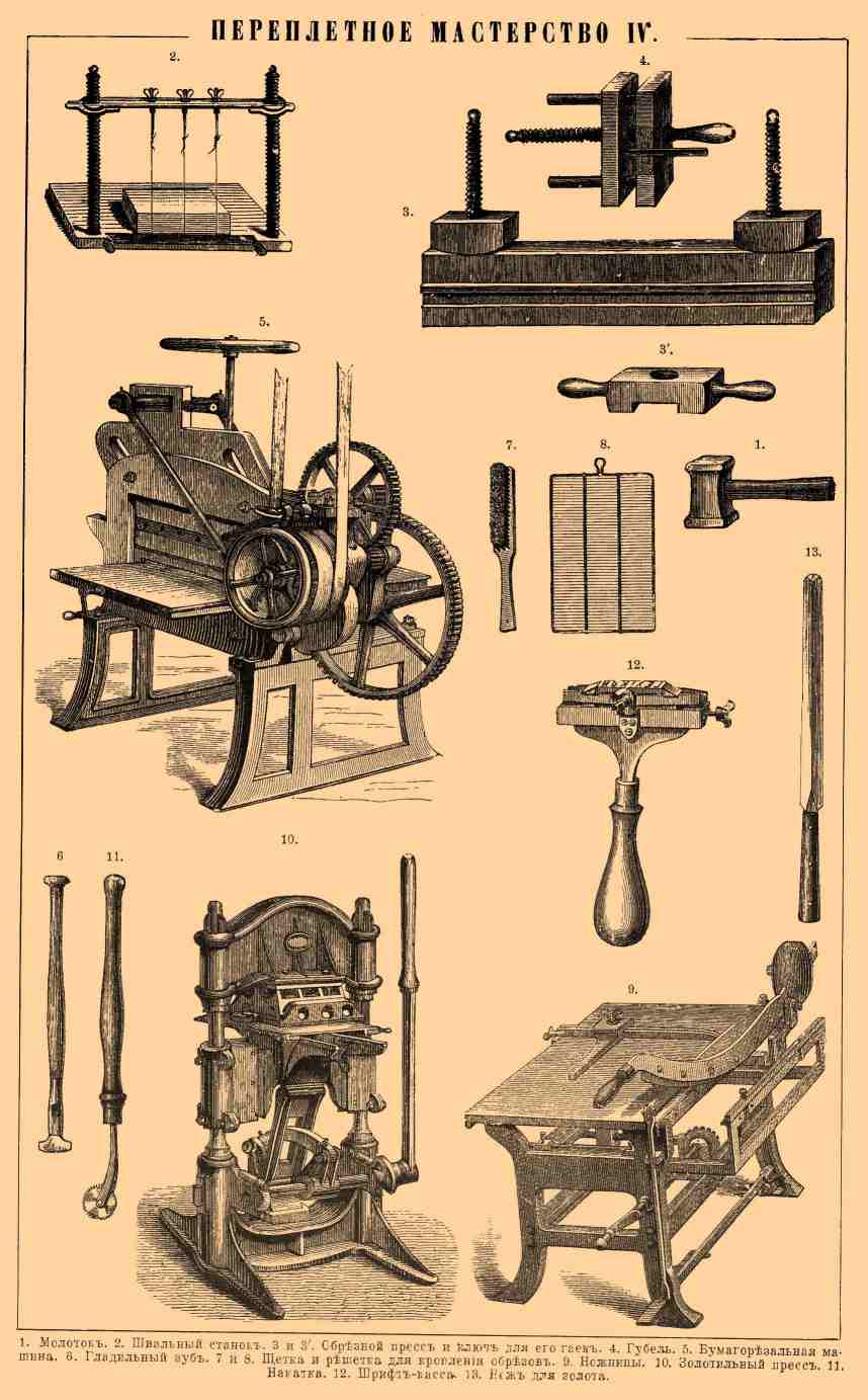 1. Молоток. 2. Швальный станок. 3 и 3'. Обрезной пресс и ключ для его гаек. 4. Губель. 5. Бумагорезательная машина. 6. Гладильный зуб. 7 и 8. Щетка и решетка для кропления обрезов. 9. Ножницы. 10. Золотильный пресс. 11. Накатка. 12. Шрифт-касса. 13. Нож для золота.