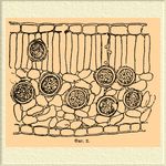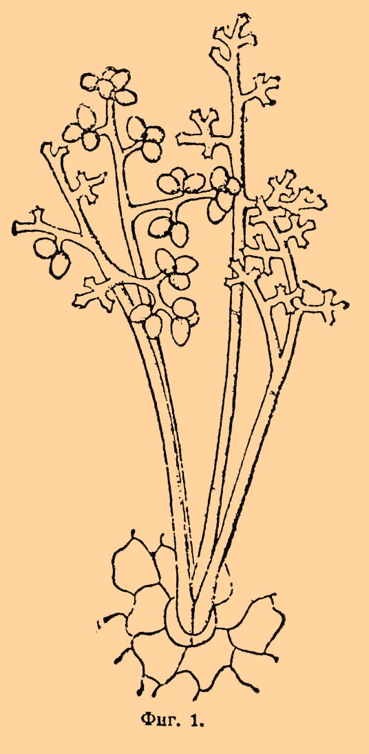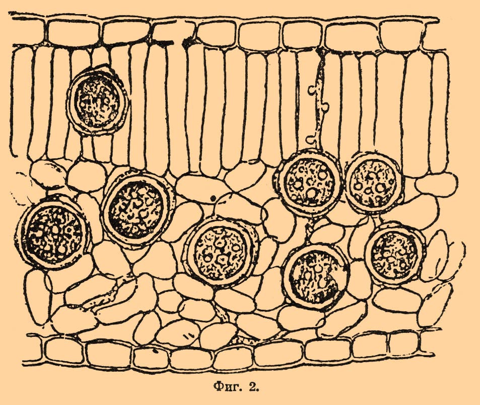 Конидии легко отваливаются, разносятся ветром, дождем и т. п., попадают на другие растения и заражают их. При прорастании конидия или прямо вытягивается в гифу, или сначала превращается в зооспорангий, в котором образуются зооспоры с двумя ресничками (фиг. 8, табл. Грибы, II a, b, c). Поплавав некоторое время, зооспора останавливается, выделяет на своей поверхности оболочку и затем уже прорастает в гифу, проникающую внутрь питающего растения. Половое размножение происходит почти всегда внутри питающего растения. В женских половых органах — оогониях, возникающих обыкновенно на концах гиф, — образуется по одному яйцу. Яйцо, оплодотворенное содержимым мужского органа — антеридия (см. Оплодотворение у растений) превращается в ооспору с толстой оболочкой (фиг. 2), прорастающую весной.