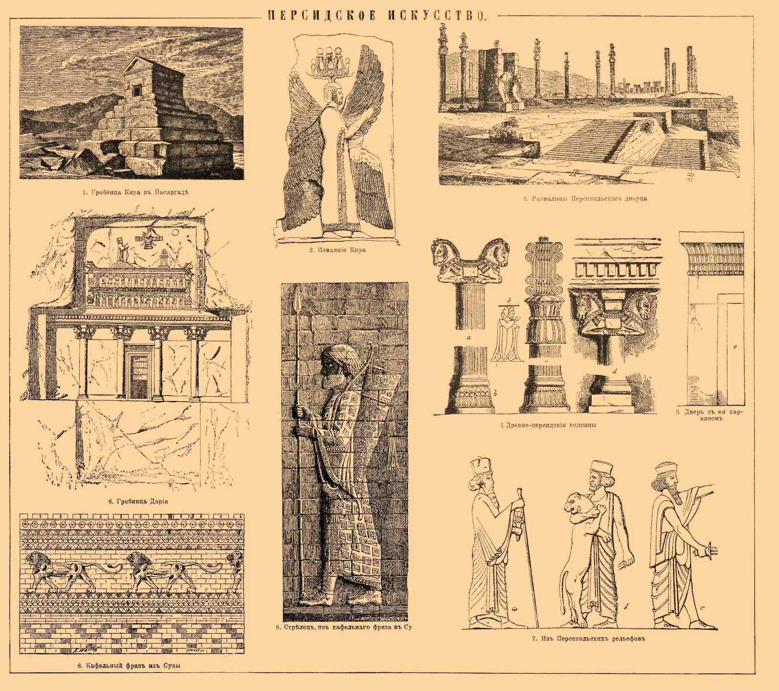 1. Гробница Кира в Пасаргаде. 2. Изваяние Кира. 3. Развалины Персепольского дворца. 4. Древнеперсидские колонны. 5. Дверь с ее карнизом. 6. Гробница Дария. 7. Из персепольских рельефов. 8. Кафельный фриз из Сузы. 9. Стрелец из кафельного фриза в Сузе.
