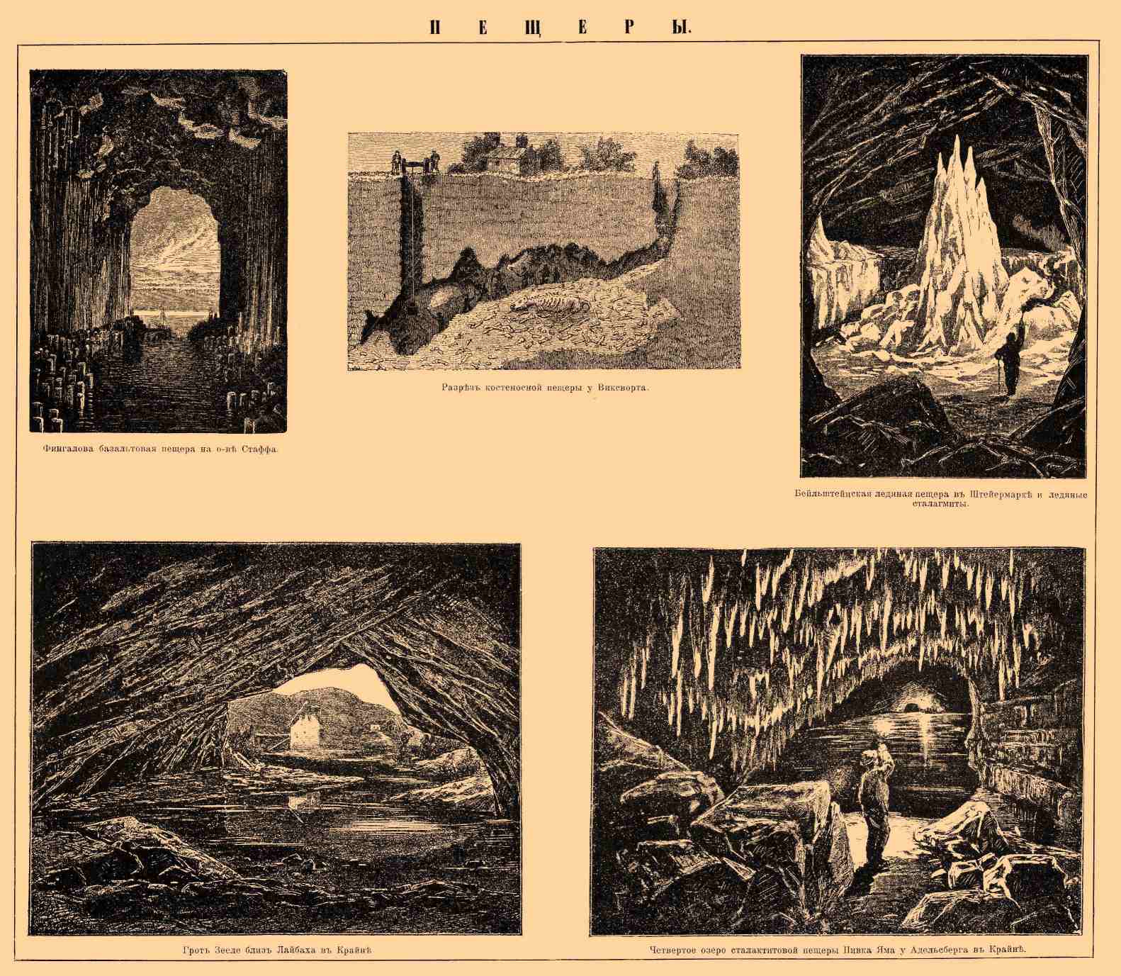 Фингалова базальтовая пещера на острове Стаффа. Разрез костеносной пещеры у Виксворта. Бейльштейнская ледяная пещера в Штейермарке и ледяные сталагмиты. Грот Зееле близ Лайбаха в Крайне. Четвертое озеро сталактитовой пещеры Пивка Яма у Адельсберга в Крайне.