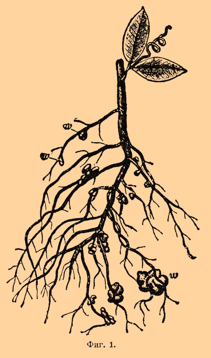 Усвоение свободного азота совершается некоторыми бактериями, а при их посредстве и высшими растениями из сем. бобовых. Относительно последних давно было известно, что они как-то благотворно влияют на почву, именно на ее азотистый запас. Было замечено, что несмотря на большое количество азота, уносимое в их урожае, почва не только не беднеет, но, видимо, обогащается им. Но откуда бобовые растения берут азот, которым они обогащают почву: это долго оставалось непонятным. На основании господствовавшего в науке учения, что свободный азот атмосферы не может служить пищею растению, обогащение почвы при культуре бобовых растений старались объяснить побочными причинами. Только в 1888 г. благодаря успехам бактериологии Гелльригелю удалось сделать блестящее открытие, что "азотособиратели" (растения из сем. бобовых) питаются свободным азотом; он показал, что заражаясь в почве особыми бактериями, эти растения приобретают способность питаться свободным азотом воздуха. При этом на корнях их появляются особые образования, так наз. клубеньки (фиг. 1, w), которых при росте в стерилизованной почве не бывает.