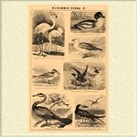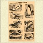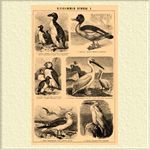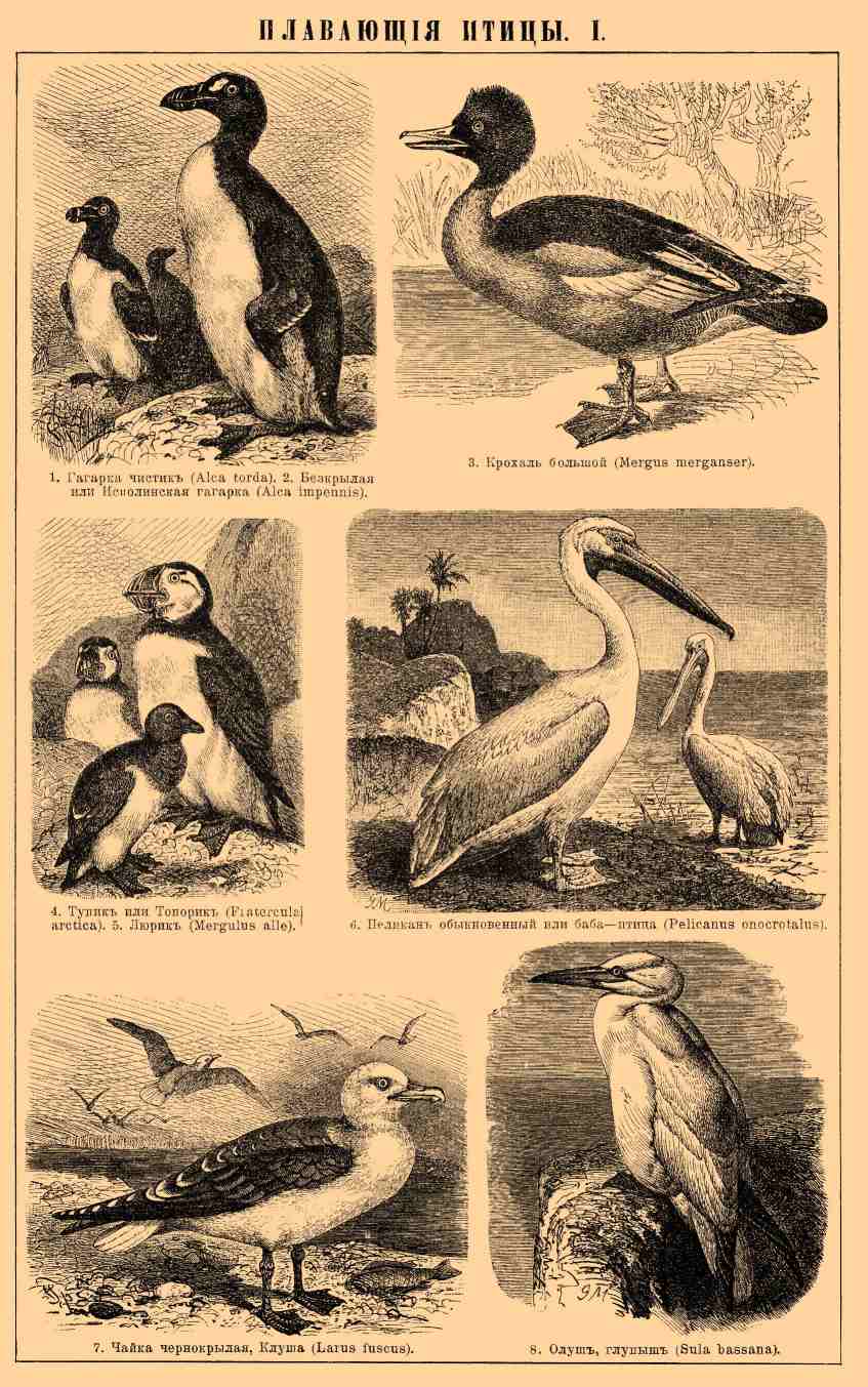 1. Гагарка чистик (Alca torda). 2. Бескрылая или исполинская гагарка (Alca impennis). 3. Крохаль большой (Mergus merganser). 4. Тупик или Топорик (Fratercula arctica). 5. Люрик (Mergulus alle). 6. Пеликан обыкновенный или баба-птица (Pelicanus onocrotalus). 7. Чайка чернокрылая. Клуша (Larus fuscus). 8. Олуш, глупыш (Sula bassana).