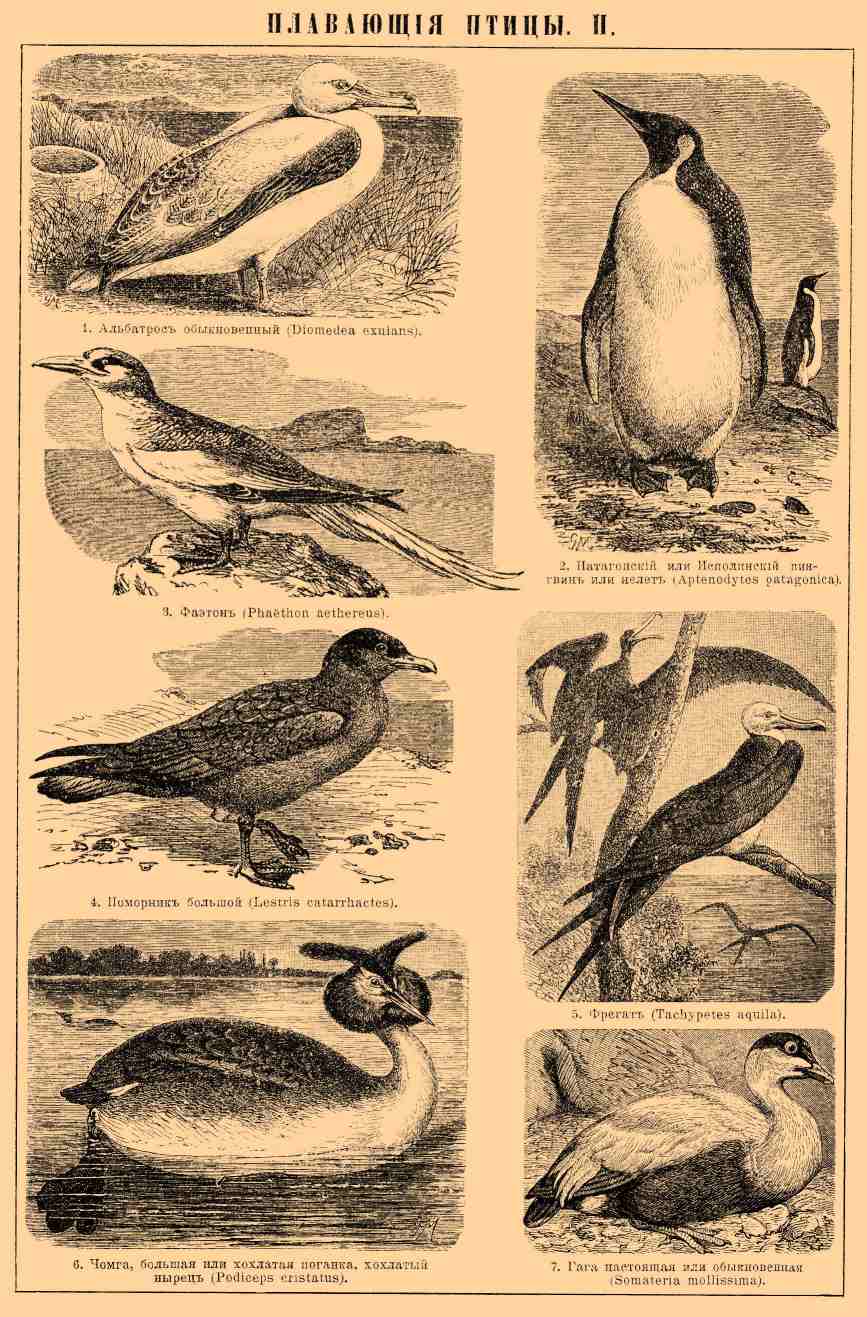 1. Альбатрос обыкновенный (Diomeda exulans).2. Патагонский или исполинский пингвин или нелет (Aptenodytes patagonica). 3. Фаэтон (Pha ë thon aethereus). 4. Поморник большой (Lestris catarrhactes). 5. Фрегат (Tachypetes aquila). 6. Чомга, большая или хохлатая поганка, хохлатый нырец (Podiceps cristatus). 7. Гага настоящая или обыкновенная (Somateria mollissima).