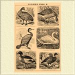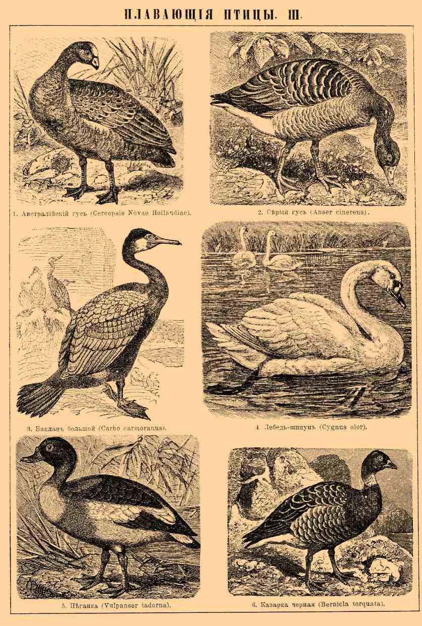 1. Австралийский гусь (Cereopsis Hollandiae). 2. Серый гусь (Anser cinereus). 3. Баклан большой (Carbo carmoranus). 4. Лебедь-шипун (Cygnus olor). 5. Пеганка (Vulpanser tadorna). 6. Казарка черная (Bernica torquata).