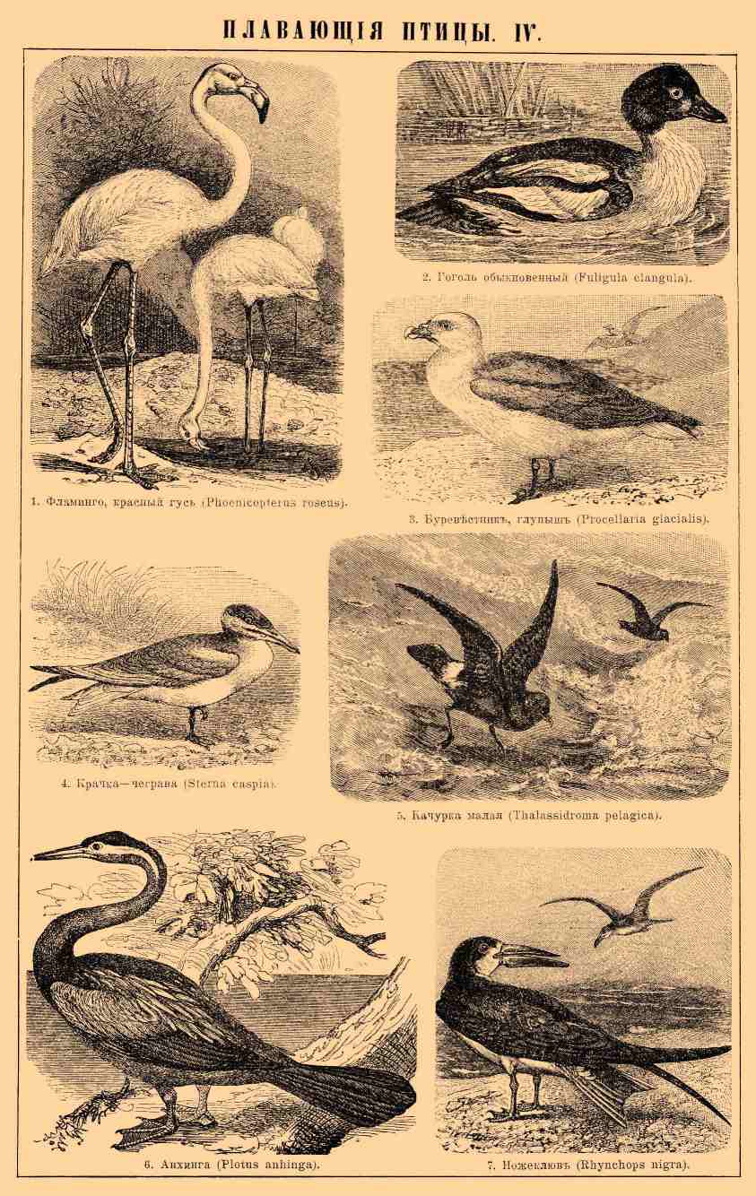 1. Фламинго, красный гусь (Phoenicopterus roseus). 2. Гоголь обыкновенный (Fuligula clangula). 3. Буревестник, глупыш (Procellaria glacialis). 4. Крачка-чеграва (Sterna caspia). 5. Качурка малая (Thalassidroma pelagica). 6. Анхинга (Plotus anhinga). 7. Ножеклюв (Rhynchops nigra).