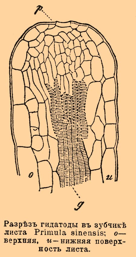 Проводящие воду ткани (g) оканчиваются в особую нежную ткань — эпитему. Эта последняя снаружи прикрыта, как и весь лист, эпидермой, но между этой последней и эпитемой остается полость, в которой прежде всего и собирается вода, чтобы затем выделиться по каплям наружу через отверстия в эпидерме — водяные поры (р). Эти последние суть устьица, только в большей или меньшей степени утратившие способность к движению и тем приспособившиеся к новой функции. Такие гидатоды и разбросаны в большом количестве, чаще всего по краю листа, в зубчиках, но также и по поверхности листовой пластинки. Они очень широко распространены среди растений, формы их очень разнообразны, а физиологически между ними различают два главных типа: в одних (каковы вышеописанные) выделение воды есть простой акт фильтрации ее из проводящих тканей в силу переполнения их; в других случаях в акте выделения активно участвуют живые клетки гидатоды; если их убить (местным отравлением сулемою), то растение лишается способности к выделению. Продукт выделения на самом деле не есть чистая вода, но обыкновенно содержание в нем твердых веществ очень ничтожно, 0,004—0,05%. В некоторых случаях, однако, с водою выделяются довольно значительные количества углекислой извести ("известковые железки"); по испарении воды последняя образует на листе чешуйки или корочки. Так бывает у многих камнеломковых (Saxifragaceae) и у некоторых папоротников (виды Polypodium, Nephrolepis). Выделение воды в виде капель наблюдается и у низших растений — у грибов (Merolius lacrymans, Mucor, Pilobolus и др.).