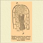 Выделение воды или водянистого сока происходит и у неповрежденных растений. Это явление по своей сущности весьма близко к только что описанному и состоит в том, что при слабом испарении (напр., ночью или в пасмурный день) из листьев по каплям вытекает вода. В тропических лесах Caesalpinia pluviosa производит таким образом настоящий дождь. То же явление можно наблюдать и ранним утром в поле, когда на многих растениях можно видеть капли воды по краям листа или на пластинке. Часто эти капли увеличиваются в объеме и падают на землю, после чего на том же месте выступает новая капля и т. д. Стало быть, это не роса, а растение выделяет избыток воды, накопившийся в нем в течение ночи. Искусственно такое выделение воды можно вызвать во всякое время, если сильно ослабить испарение, поместив растение в замкнутый и насыщенный водяными парами приемник. Вода выделяется при посредстве особых приспособлений или органов растения, называемых эмиссариями (Молль) или гидатодами (Габерландт). Это — потовые железы растения. На приложенном рис. изображена такая гидатода в разрезе.