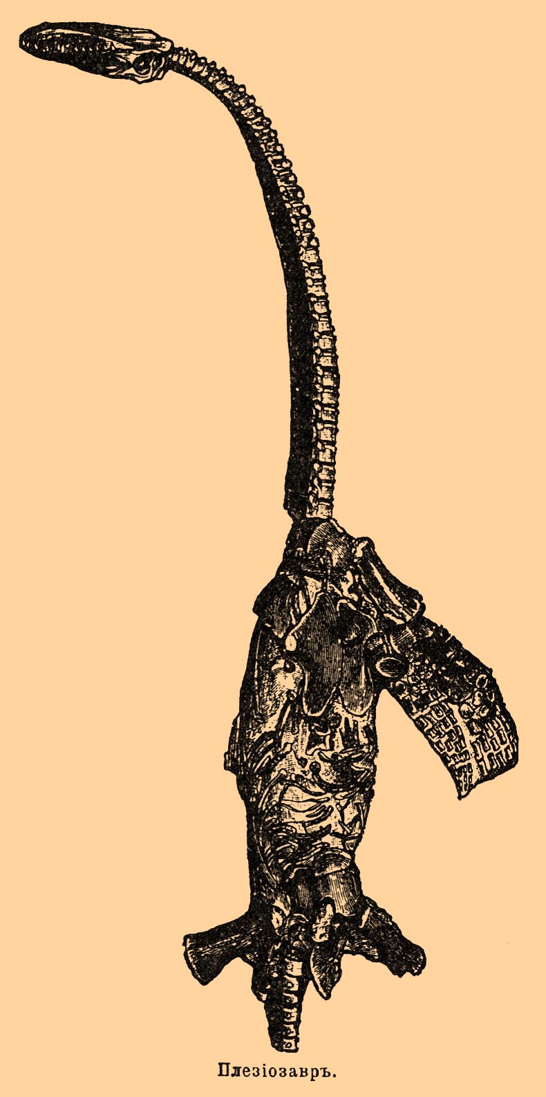 — вымерший морской ящер мезозойской эры; достигал 3 м длины и соединял в себе характерные особенности различных классов современных животных. Короткое туловище вследствие сильного развития таза, грудной кости, лопаток и ключиц, снабженных длинными отростками, было заключено как бы в массивный костный ящик, чем напоминает туловище черепах, и заканчивалось довольно длинным хвостом. Чрезвычайно длинная, тонкая шея состояла из 24—41 почти плоских позвонков, постепенно утончавшихся к голове, снабженных зачаточными боковыми отростками и равнялась по длине всему туловищу вместе с хвостом. Шея венчалась небольшой вытянутой плоской головкой, сформированной по типу головы ящерицы. Укороченные пятипалые передние и задние конечности представляют полнейшее сходство с ластами современных китообразных и потому вряд ли этот ящер мог передвигаться по суше.