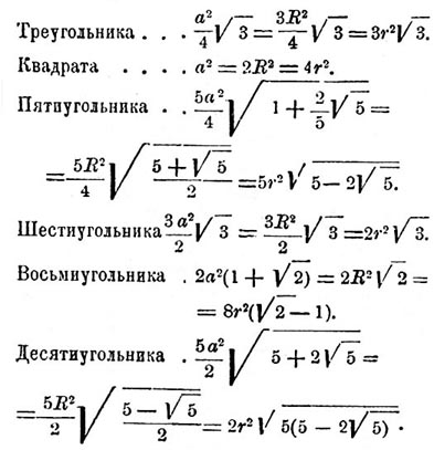 А. Выражения величин П. правильных многоугольников, в которых а означает длину стороны, R — длину радиуса описанного круга, r — длину радиуса вписанного круга.