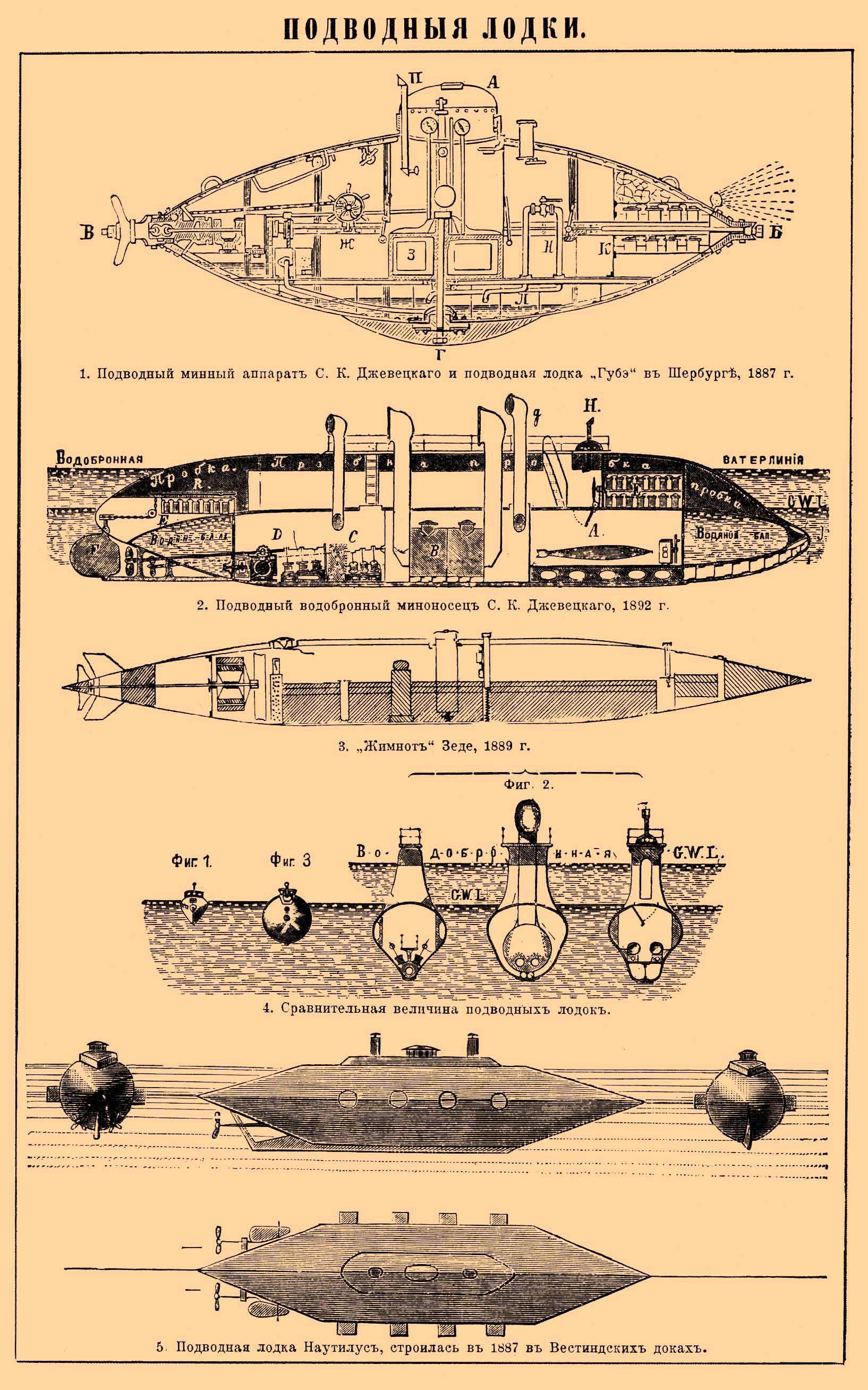 1. Подводный минный аппарат С. К. Джевецкого и подводная лодка "Губэ" в Шербурге, 1887 г. 2. Подводный водоборонный миноносец С. К. Джевецкого, 1892 г. 3. "Жимнот" Зеде, 1889 г. 4. Сравнительная величина подводных лодок. 5. Подводная лодка "Наутилус", строилась в 1887 г. в Вест-Индских доках.