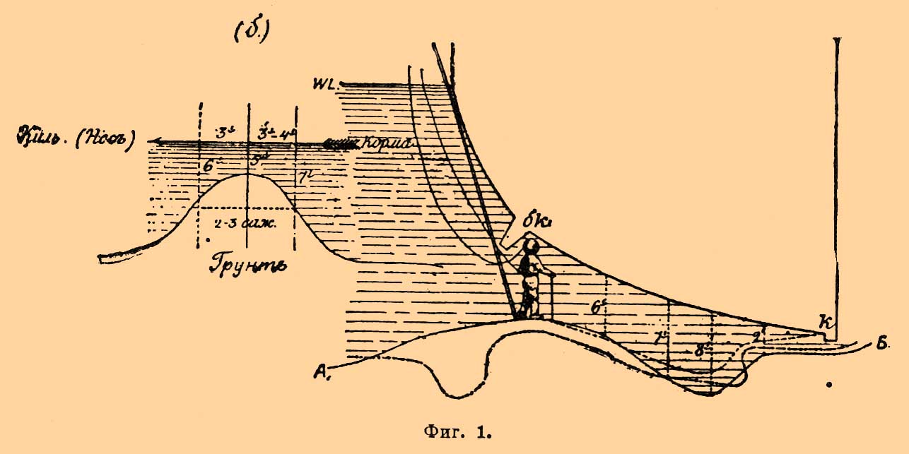 Против данной марки у борта спускали в воду наклонно под судно шест, по которому посылали водолаза и положение которого в натуре и на чертеже — определялось вполне по двум точкам: 1) отстояние от борта по поверхности воды верхней части шеста и касания его к боковому килю (фиг. 1) или отстояние от бокового киля, измеряемому водолазом, или же (как это видно на фиг. 2) шест упирался в дейдвудную трубу вала левого гребного винта; точно определенная линия шеста — проводится на чертеже; затем водолаз, спускаясь к шесту на грунт, становится ногами у шеста (фиг. 1), нащупывая над своею головой боковой киль и днище крейсера; если же, став у шеста, он не мог достать их, напр. при выс. в 10 фт., тогда он поднимал железный щуп и определял характерный угол между днищем и боковым килем; начертив отвесную линию, равную измеренным 10 фт., при пересечении ее с шестом получим точку грунта в этом месте; далее водолаз, сделав 3 шага, упирается своим шлемом в днище; здесь мы отложим рост водолаза = 6 фт.; потом он ложится, получается длина его роста + длина руки и измерения щупом и т. д. Все эти измерения передаются им по телефону наверх и записываются; кроме того, по выходе его из воды в теплом помещении его расспрашивают, заставляют начертить и т. д. (фиг. 3).