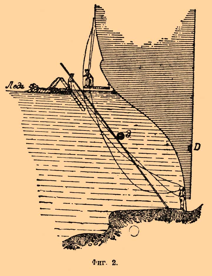 2) Добывание утопленных с судна небольших вещей. Отыскание всякой мелочи на дне, особенно — илистом, представляет множество затруднений; поэтому надобно как можно скорее бросать буек вслед за вещью и по возможности как раз на нее. Если утоплена крупная вещь, то устраивают тралы, которые и буксируются; как только трал зацепит за что-нибудь, спускают водолаза для осмотра, за что зацепили, и очищают трал, пока не зацепят за то, что отыскивается; такой способ позволяет искать на большем пространстве и всегда почти успешен. Менее крупную, но ценную вещь (напр. мину) можно искать водолазным строем, т. е. собравшись к буйкам не менее 3—4 шлюпок с водолазами; шлюпки выстраиваются, соединившись фалинями от 10 до 40 саж.; водолазы спускаются одновременно на дно, имея в руках, каждый к соседу, тонкий трал (лотлинь). По условленному сигналу все шлюпки гребут и буксируют за собой своих водолазов; и как только трал зацепит или один из водолазов наткнется на что-либо, сейчас же он подает о том сигнал. Сделав насколько таких галсов, вещь можно отыскать без особого утомления водолазов.